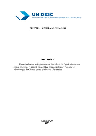 O documento descreve o portfólio de um aluno de Sistema de Informação contendo relatórios de aulas de diferentes disciplinas ao longo de agosto e setembro de 2011. As aulas incluem Matemática, Metodologia da Ciência e Gestão de Carreira.