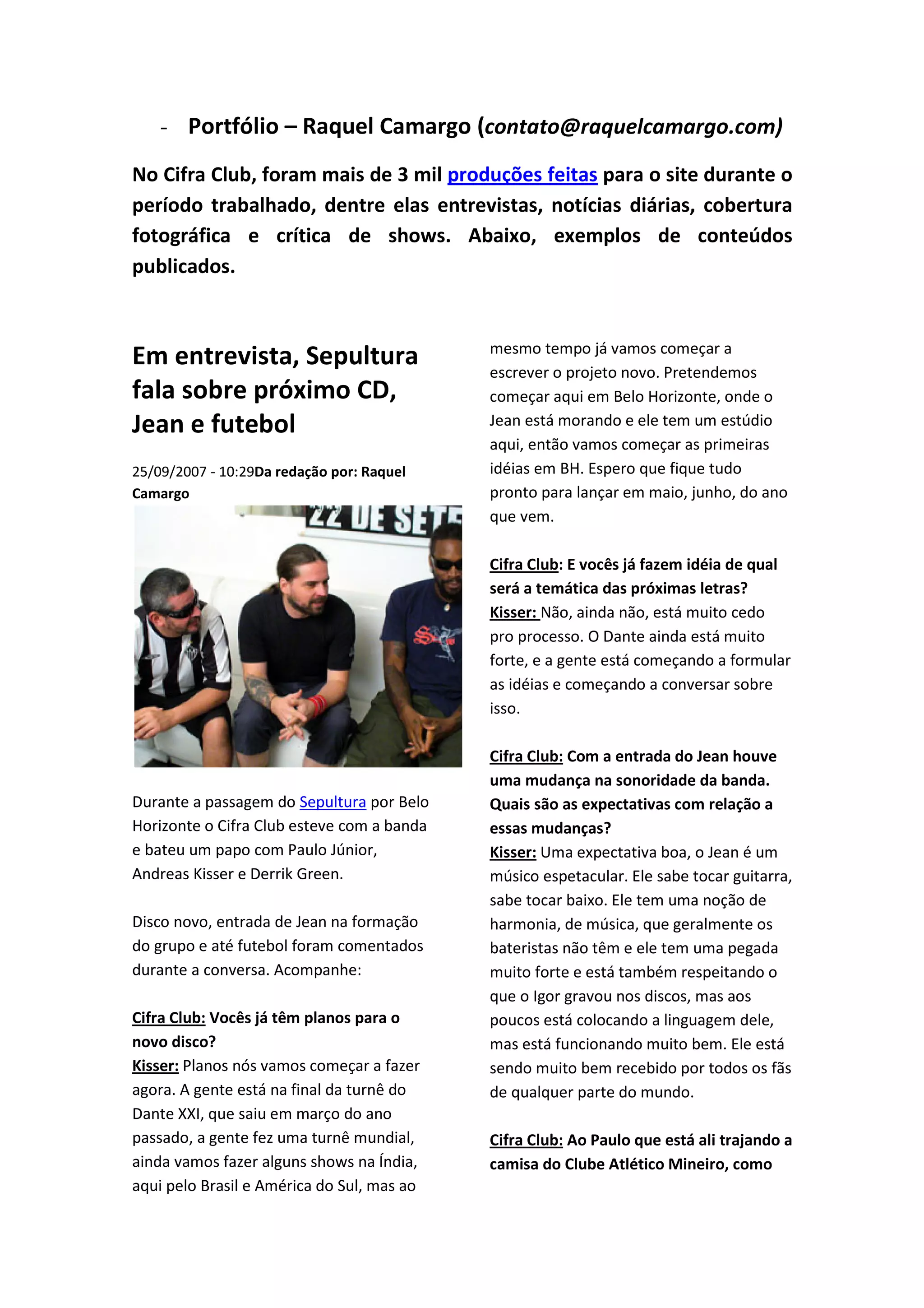 Raquel Camargo trabalhou no Cifra Club, onde produziu mais de 3 mil publicações como entrevistas, notícias diárias e cobertura fotográfica de shows. Exemplos de seu trabalho incluem uma entrevista com a banda Sepultura e uma resenha do show de Joe Satriani.