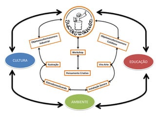 1) O documento descreve as atividades e workshops de Marco Antonio utilizando materiais reaproveitados para criar instrumentos musicais, objetos sonoros e arte.