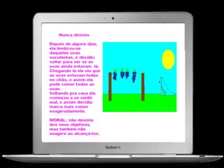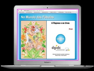 Este documento descreve um projeto para ensinar fábulas na sala de aula e na sala de tecnologia da escola. O projeto tem como objetivo capacitar professores a usar recursos tecnológicos em suas aulas e despertar o interesse dos alunos pela leitura de fábulas usando ferramentas digitais. As atividades incluem ler fábulas em sala de aula e online, ilustrar as fábulas, e produzir reconto de fábulas em um site educacional.