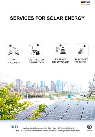 A empresa oferece consultoria, engenharia, conteúdos e capacitação para o setor fotovoltaico, tendo realizado mais de 50 assessorias, projetado 250 sistemas de até 1 MWp e treinado mais de 4.000 profissionais.