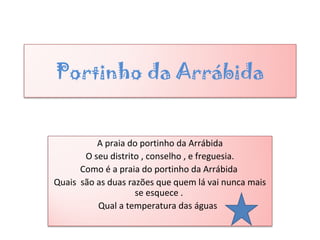 O Portinho da Arrábida é uma das praias mais belas de Portugal, com águas cristalinas e areia branca. Localiza-se na Serra da Arrábida e é conhecida por sua beleza rara e águas frias. Faz parte do concelho e distrito de Setúbal, na freguesia de São Lourenço.