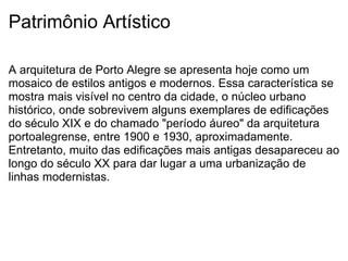 A arquitetura de Porto Alegre apresenta um mosaico de estilos antigos e modernos, com alguns exemplares do século XIX e início do século XX preservados no centro histórico, apesar de muitos edifícios antigos terem dado lugar à urbanização modernista. As artes visuais são ensinadas e produzidas desde 1908 pelo Instituto Livre de Belas Artes, que formou muitos artistas renomados. O folclore de Porto Alegre resulta das tradições dos imigrantes e povos originários, expresso na dan