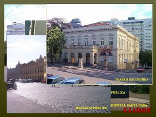 O documento apresenta fotos e informações sobre a cidade de Porto Alegre, capital do estado do Rio Grande do Sul, no sul do Brasil. Descreve pontos turísticos como o Monumento "O Laçador", a Ponte do Guaíba, a Avenida Castelo Branco, o Cais do Porto e prédios governamentais. Também fornece detalhes sobre a história, cultura, clima e estilo de vida dos habitantes locais.