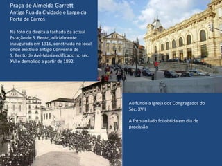 O documento apresenta uma série de fotos e informações sobre locais históricos da cidade do Porto em Portugal, comparando imagens atuais com fotos antigas dos mesmos locais. As fotos mostram lugares como a Praça de Almeida Garrett, a Casa do Infante, a Rua de S. Sebastião, o Arco das Verdades, a Rua dos Canastreiros e a Praça de Carlos Alberto, entre outros, destacando suas origens e transformações ao longo do tempo.