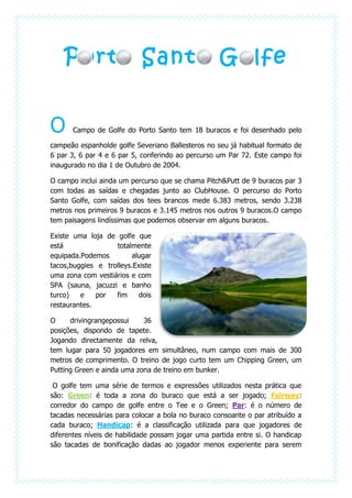 O Porto Santo Golfe é um campo de golfe de 18 buracos no Porto Santo projetado por Severiano Ballesteros. O campo inclui um percurso Pitch & Putt de 9 buracos, lojas de golfe, vestiários e restaurantes. O Porto Santo Golfe sediou o Madeira Island Open de Golfe em 2009 e oferece aulas para iniciantes e jogadores experientes melhorarem seus handicaps.