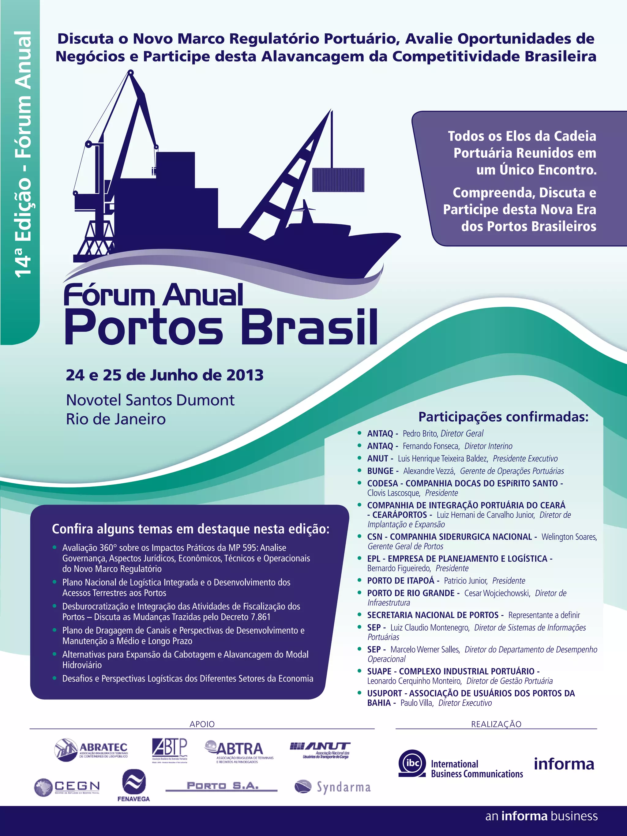 O documento descreve a programação de um fórum anual sobre portos no Brasil. Participarão representantes de agências governamentais, empresas portuárias e de logística, além de associações do setor. Serão discutidos temas como o novo marco regulatório portuário, desafios da multimodalidade e expansão da infraestrutura portuária. O evento ocorrerá em junho e contará com palestras, painéis e workshops sobre regulamentação, investimentos, operações e perspectivas dos diferentes segmentos econômicos.