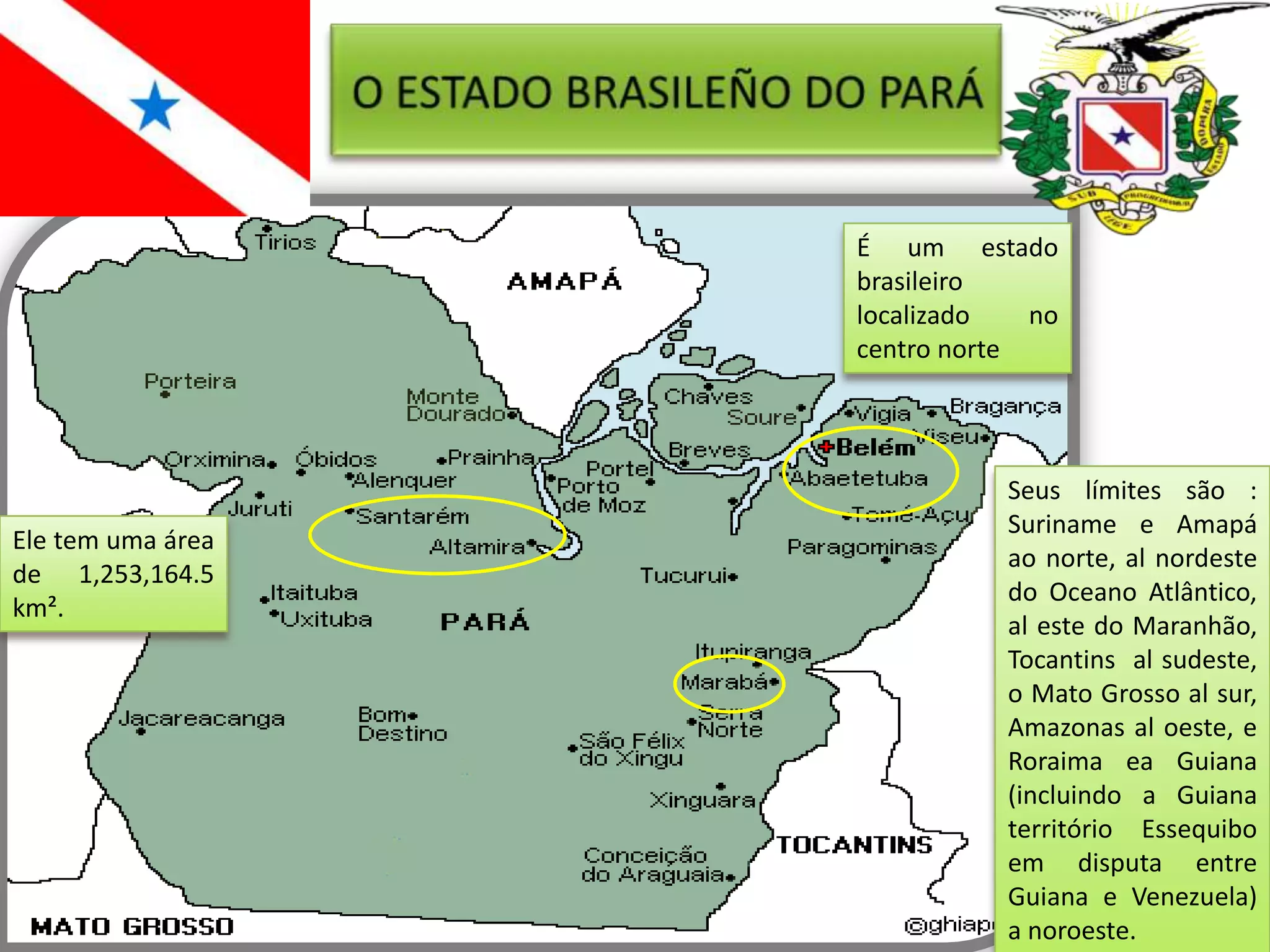 O documento descreve o estado brasileiro do Pará, localizado no norte do Brasil. O Pará tem uma área de 1,253,164.5 km2 e limites com outros estados brasileiros e países vizinhos. A economia do Pará é baseada em agricultura, pecuária, indústria e extração mineral, principalmente de ferro e bauxita na Serra de Carajás. Os principais rios do estado são o Amazonas, Tapajós, Tocantins, Pará e Jari.