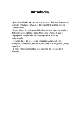 O documento discute língua e linguagem, níveis de linguagem e funções de linguagem. Apresenta os conceitos de língua, variedades linguísticas e linguagem. Explica os níveis de linguagem formal, informal, técnico e literário com exemplos. Também explica as seis funções de linguagem - referencial, emotiva, conativa, metalinguística, fática e poética - com exemplos para cada uma.