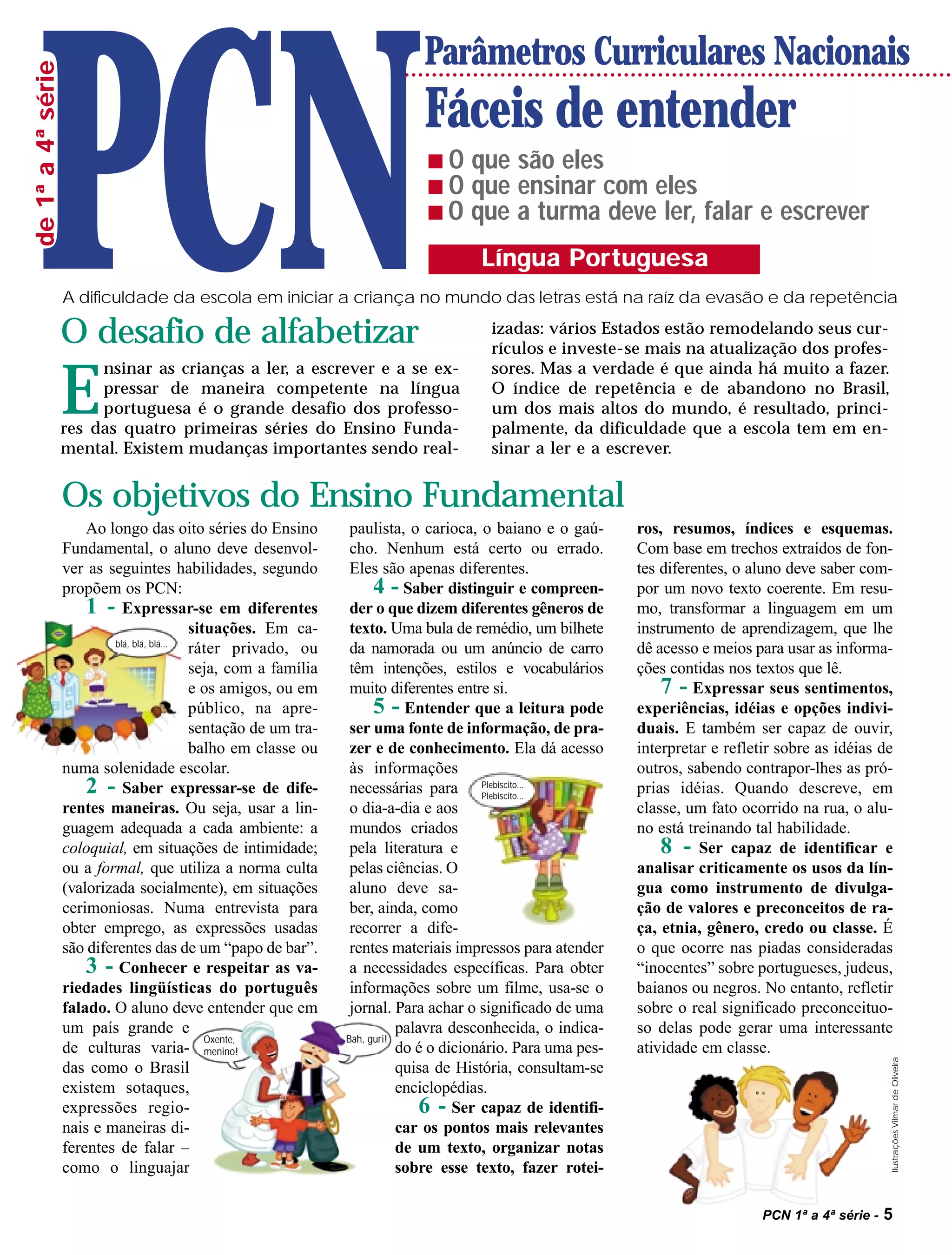 O documento discute os Parâmetros Curriculares Nacionais para as quatro primeiras séries do Ensino Fundamental, focando na alfabetização e no desenvolvimento da linguagem oral e escrita das crianças. Ele explica que o objetivo é que os alunos dominem a linguagem de maneira eficaz ao final da 4a série, sendo capazes de produzir e interpretar textos para a vida cotidiana e o acesso à cultura. Também fornece dicas sobre como ensinar a ler, escrever, falar e desenvolver diferentes habilidades