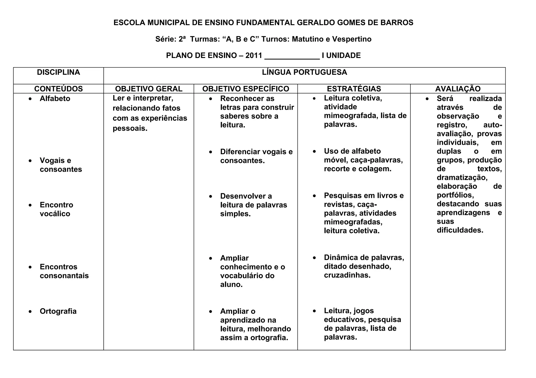 O documento apresenta o plano de ensino de Língua Portuguesa para alunos do 2o ano do Ensino Fundamental da Escola Municipal Geraldo Gomes de Barros. O plano inclui os conteúdos a serem abordados ao longo do ano letivo, divididos em quatro unidades, com os objetivos gerais e específicos e as estratégias e formas de avaliação para cada conteúdo.