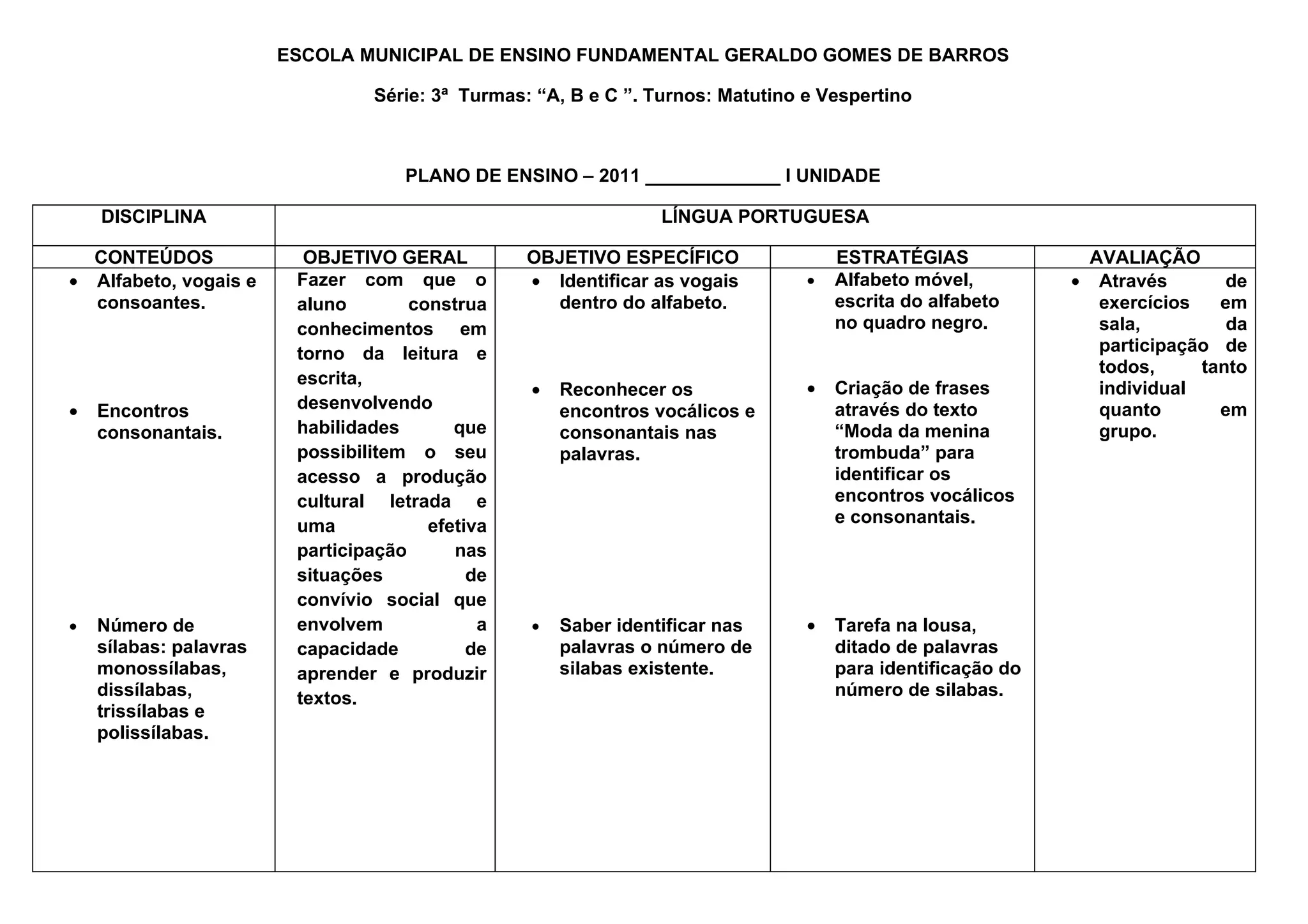 1) O documento apresenta o plano de ensino de Língua Portuguesa para alunos da 3a série do Ensino Fundamental, com os conteúdos, objetivos e estratégias para 4 unidades didáticas.