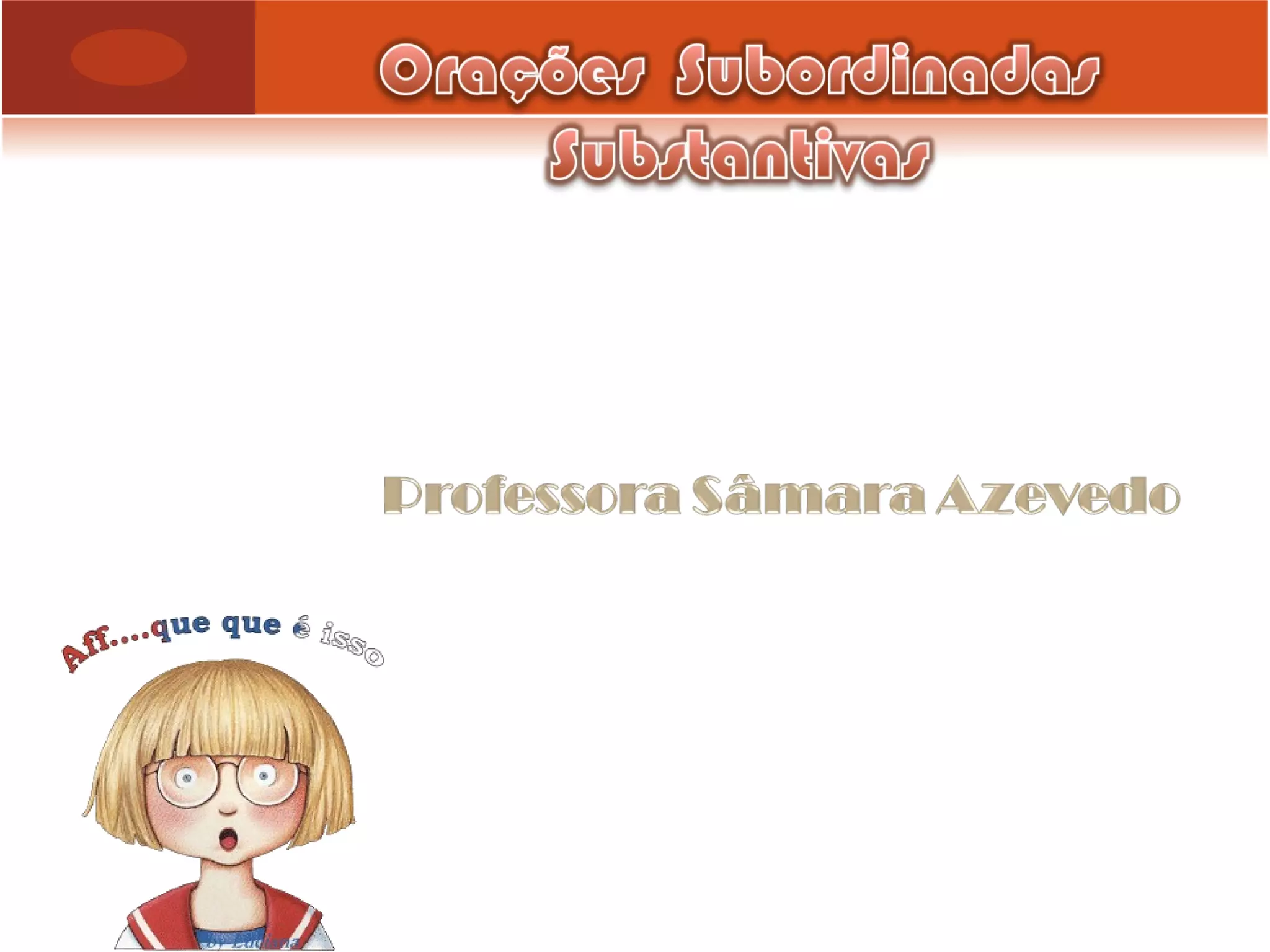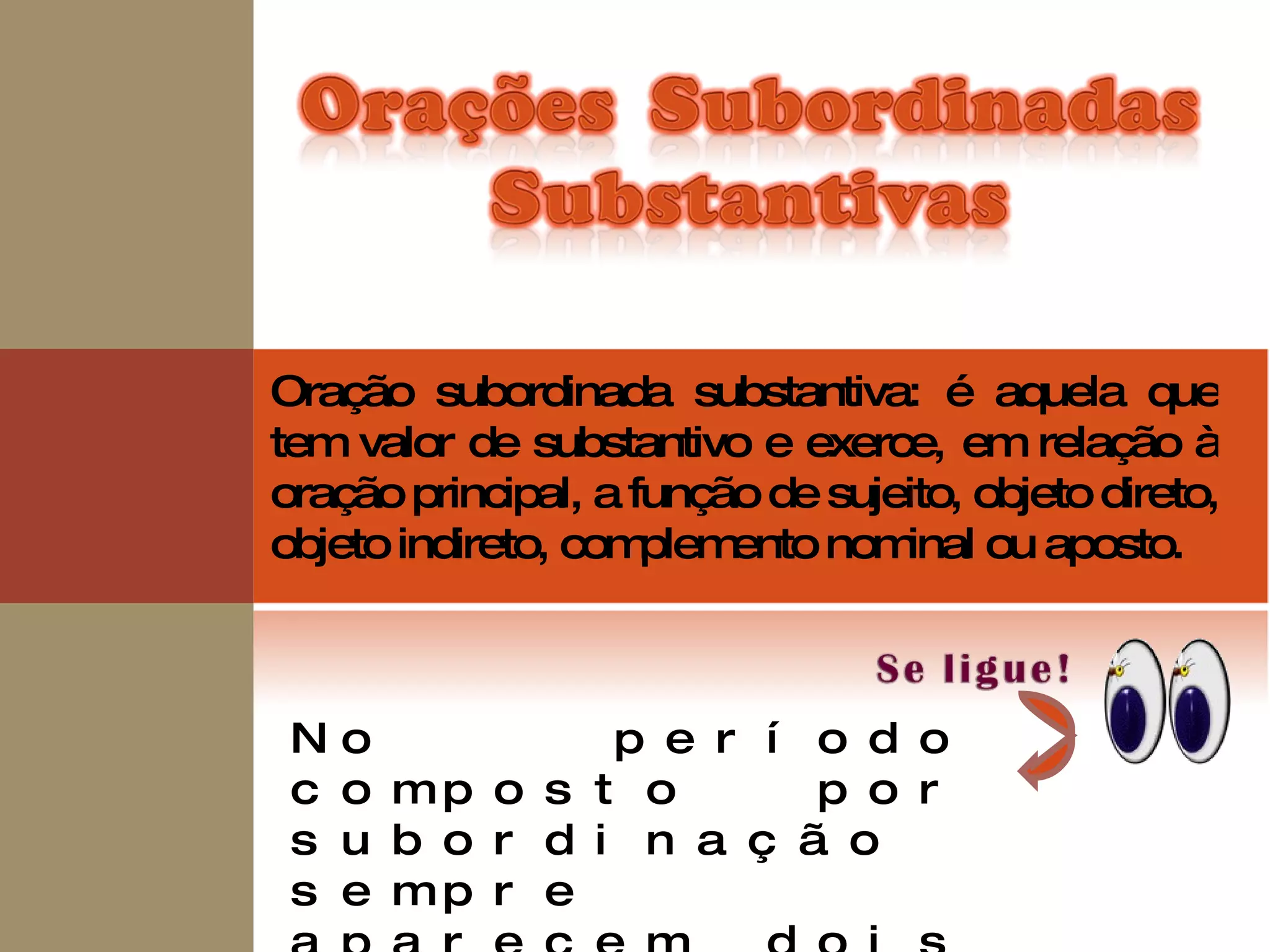 O documento descreve os tipos de orações subordinadas substantivas em português. Existem seis tipos: oração subordinada substantiva objetiva direta, objetiva indireta, subjetiva, predicativa, apositiva. Cada tipo exerce uma função gramatical diferente na oração principal, como sujeito, objeto direto ou indireto.
