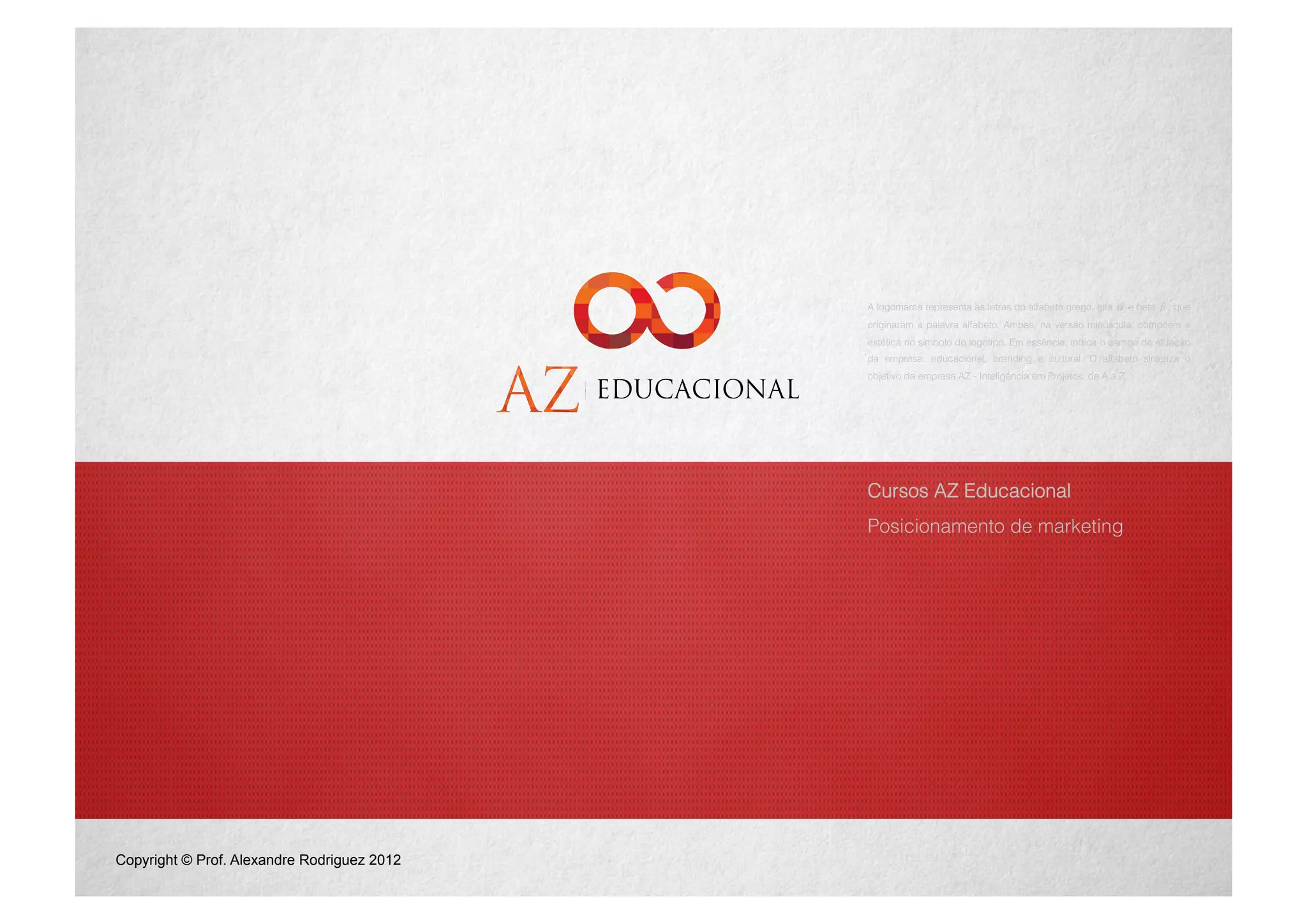 O documento descreve a logomarca da empresa AZ - Inteligência em Projetos, representando as letras alfa e beta do alfabeto grego, indicando que a empresa atua nos campos educacional, de branding e cultural, sintetizando seu objetivo de oferecer serviços de A a Z.