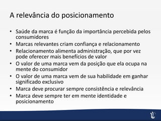 O documento aborda a importância do posicionamento de marcas, destacando como a sua relevância impacta a saúde da marca e a construção de relacionamentos de confiança com os consumidores. Apresenta ainda a evolução do conceito de posicionamento desde os anos 40, a sua aplicação em estratégias de marketing e as vantagens competitivas que um bom posicionamento pode proporcionar. Além disso, discute o processo de segmentação e a necessidade de uma análise estratégica para definir e diferenciar a marca no mercado.