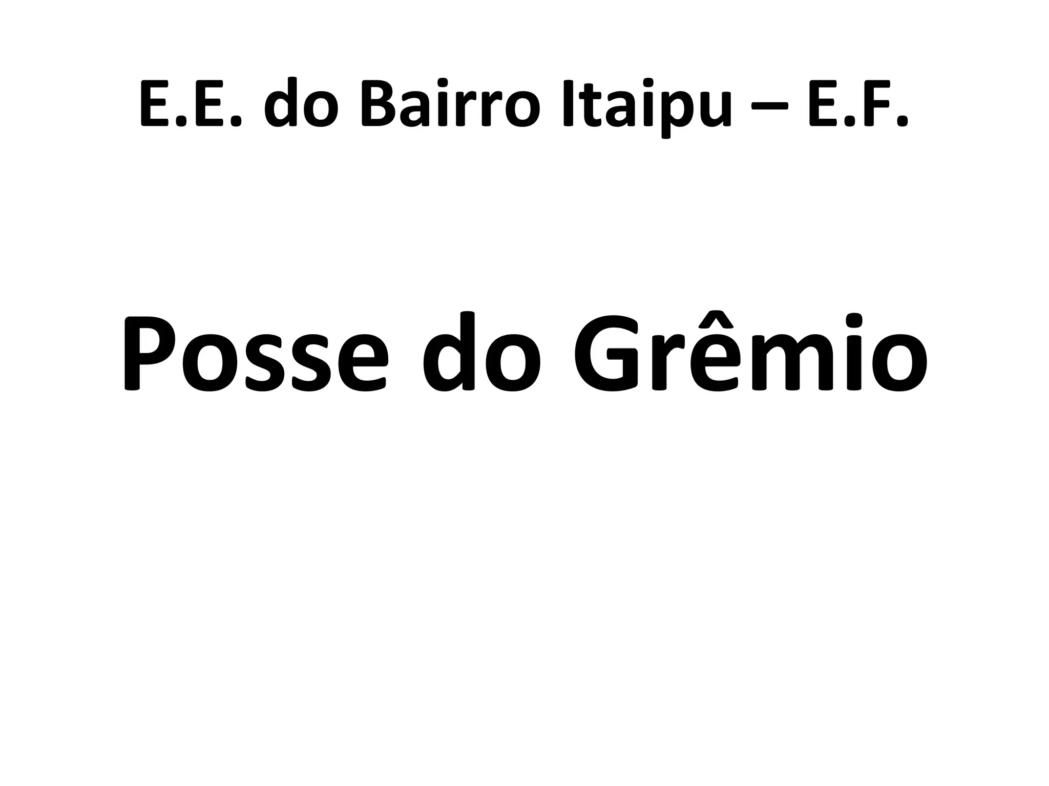 A escola E.E. do Bairro Itaipu realizou a posse do Grêmio Estudantil da E.F. Este evento marca a transição de liderança dos estudantes para o novo ano letivo. O Grêmio tem a importante função de representar os alunos e promover atividades que contribuam para a educação e o desenvolvimento dos estudantes.