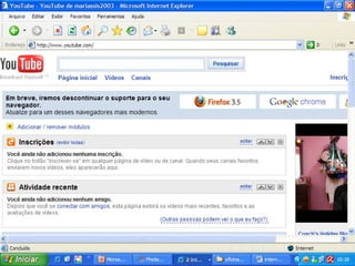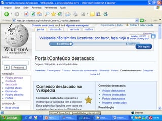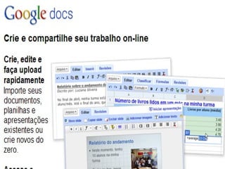 O documento discute várias ferramentas digitais como Picasa, Google Sites, Biblioteca Virtual, Wikipédia, YouTube e blogs, e como elas podem ser usadas para compartilhar fotos, criar sites, acessar conteúdo cultural, contribuir com conhecimento colaborativo, compartilhar vídeos e comunicar online. Ele também menciona questões de direitos autorais e como blogs podem ser usados como recursos pedagógicos.