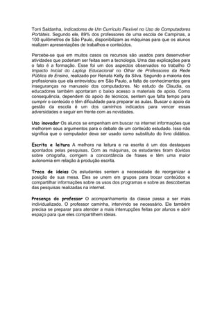 Os estudos mostraram que o uso de laptops nas salas de aula trouxe mudanças na gestão das aulas e dos conteúdos, como a necessidade de maior movimentação dos alunos para troca de informações e alterações no uso do espaço e gestão do tempo. Os professores passaram a usar mais recursos digitais para auxiliar em aulas expositivas e propor exercícios, mas em muitos casos os recursos são usados para atividades que poderiam ser feitas sem a tecnologia, devido à falta de formação adequada.