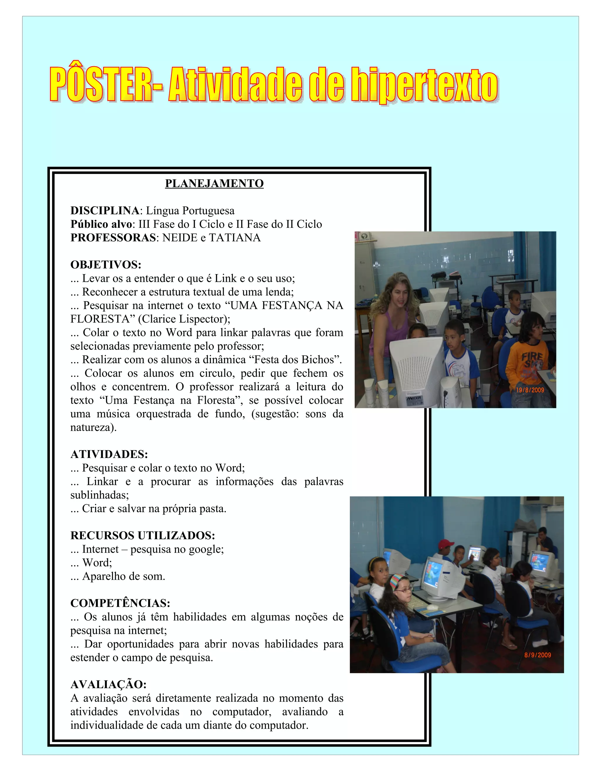 Este plano de aula de Língua Portuguesa para alunos do 3o ano do Ensino Fundamental e 2o ano do Ensino Médio tem como objetivos ensinar sobre links, a estrutura de lendas e realizar atividades com o texto "Uma Festança na Floresta". As atividades incluem pesquisar o texto na internet, linkar palavras selecionadas e uma dinâmica sobre animais. Os recursos utilizados são a internet, Word e som.