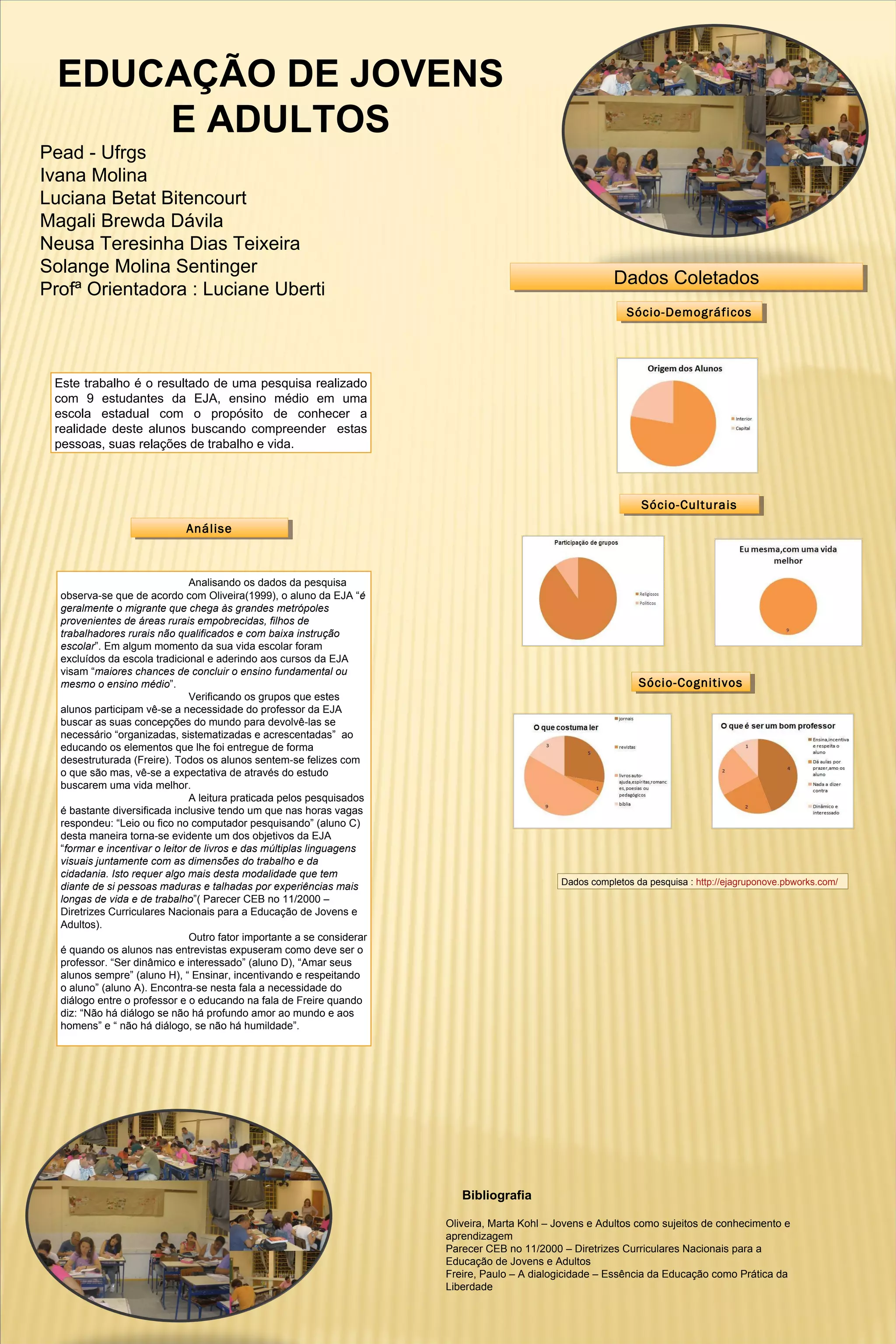 Este documento descreve uma pesquisa sobre 9 estudantes da Educação de Jovens e Adultos (EJA) em uma escola pública. A pesquisa coletou dados sócio-demográficos, sócio-culturais e sócio-cognitivos sobre os alunos. Os resultados mostraram que os alunos da EJA geralmente vêm de áreas rurais pobres e buscam melhorar de vida através dos estudos. A leitura entre os alunos é diversificada e a pesquisa destaca a importância do diálogo entre profess