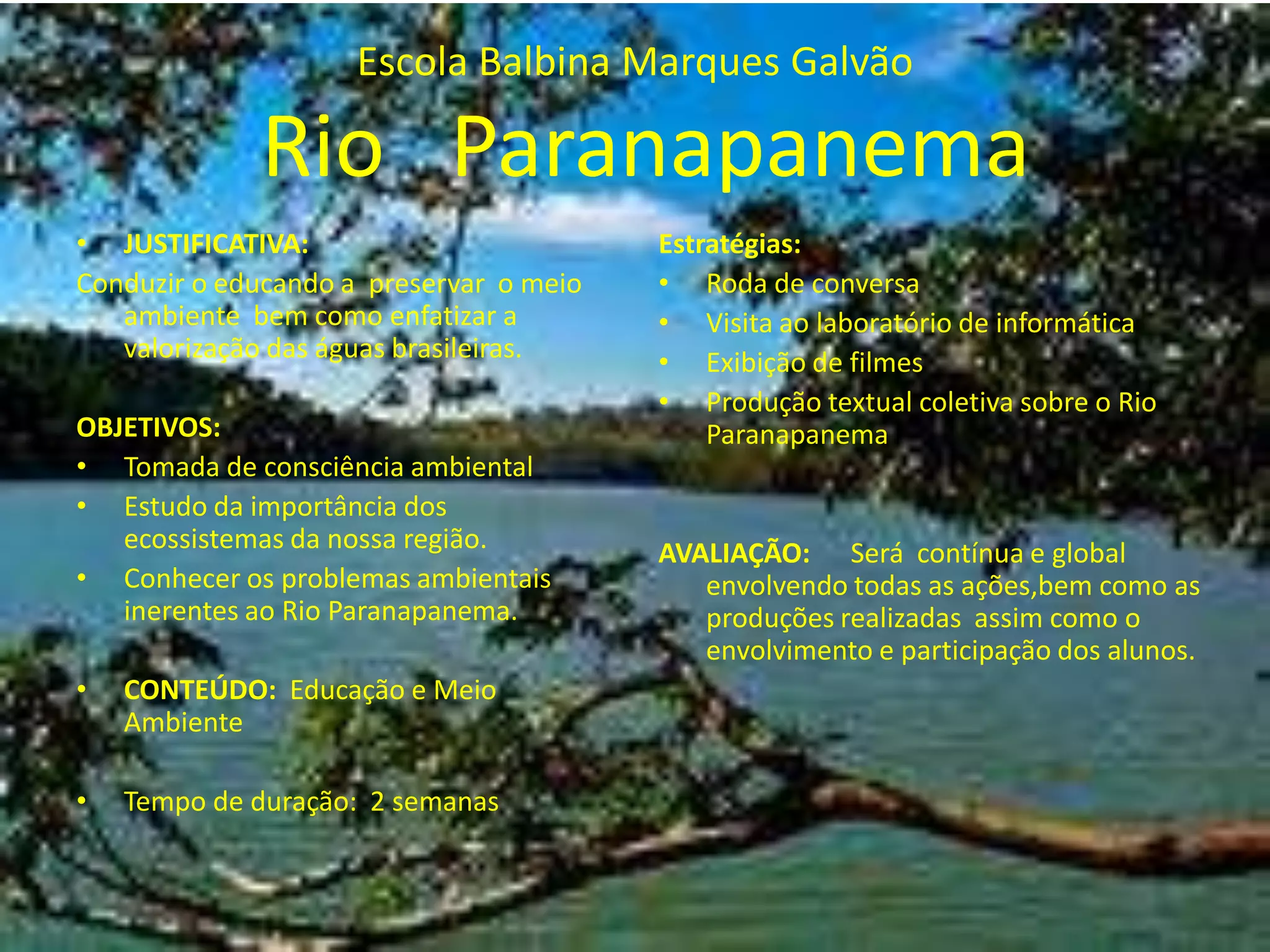 A escola Balbina Marques Galvão planeja um projeto de duas semanas sobre educação e meio ambiente para conscientizar os alunos sobre a importância dos ecossistemas da região e os problemas do Rio Paranapanema, usando estratégias como rodas de conversa, visitas de laboratório, exibições de filmes e produção textual coletiva. A avaliação será contínua e global, considerando o envolvimento dos alunos em todas as atividades.