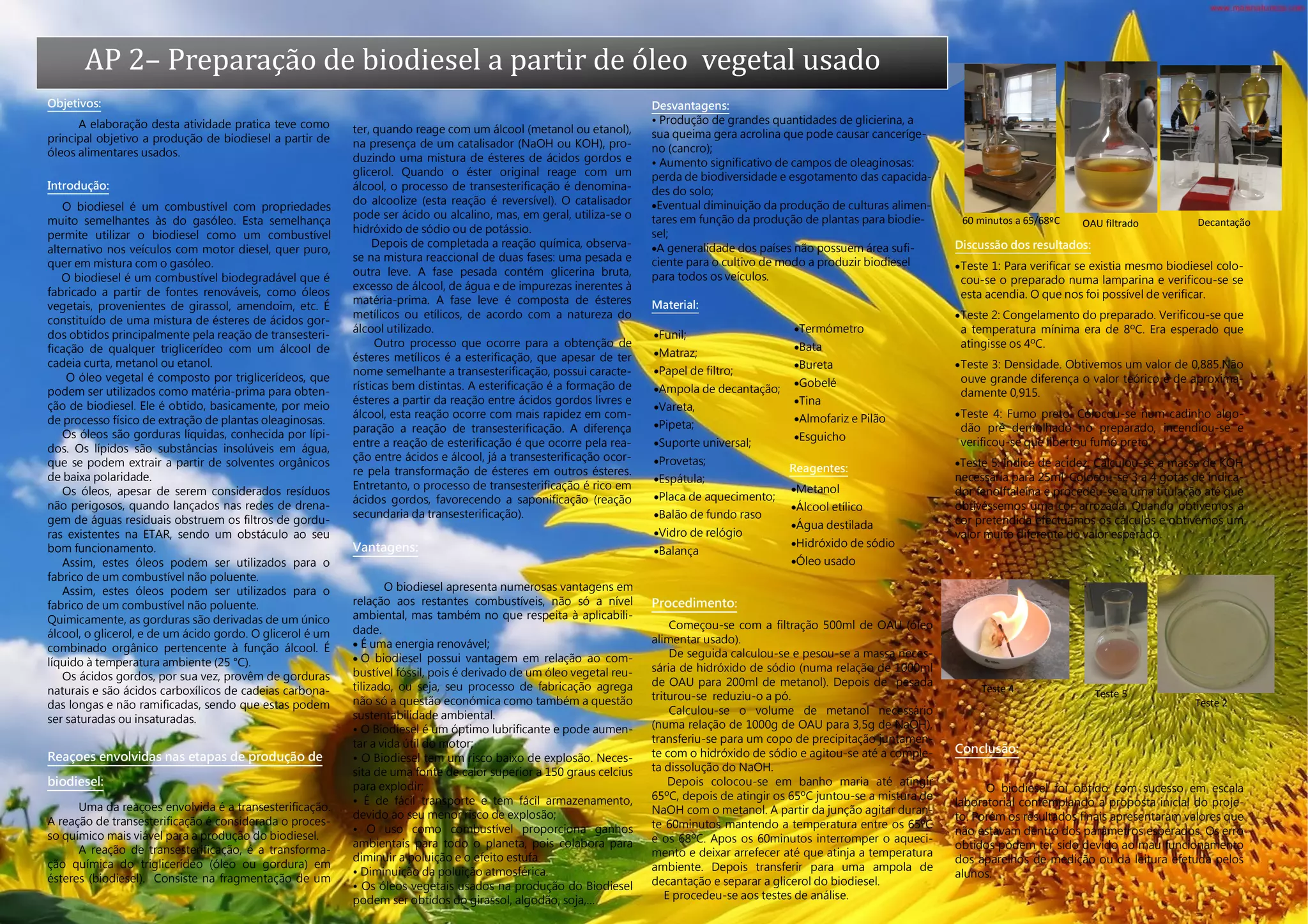 Este documento descreve o processo de produção de biodiesel a partir de óleos alimentares usados. O objetivo era produzir biodiesel em laboratório através da reação de transesterificação entre o óleo usado, metanol e hidróxido de sódio. Embora o biodiesel tenha sido produzido, os resultados dos testes realizados não corresponderam totalmente aos valores esperados, possivelmente devido a erros nos equipamentos ou procedimentos.