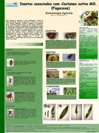 Este documento descreve insetos associados com a castanheira (Castanea sativa), incluindo besouros, percevejos, pulgões, gafanhotos e formigas. Os besouros causam danos diretos perfurando os ouriços e galerias nas sementes, enquanto percevejos e pulgões mancham as castanhas. Gafanhotos e formigas causam danos indiretos desfolhando as árvores. O documento fornece detalhes sobre as espécies observadas e os danos causados.