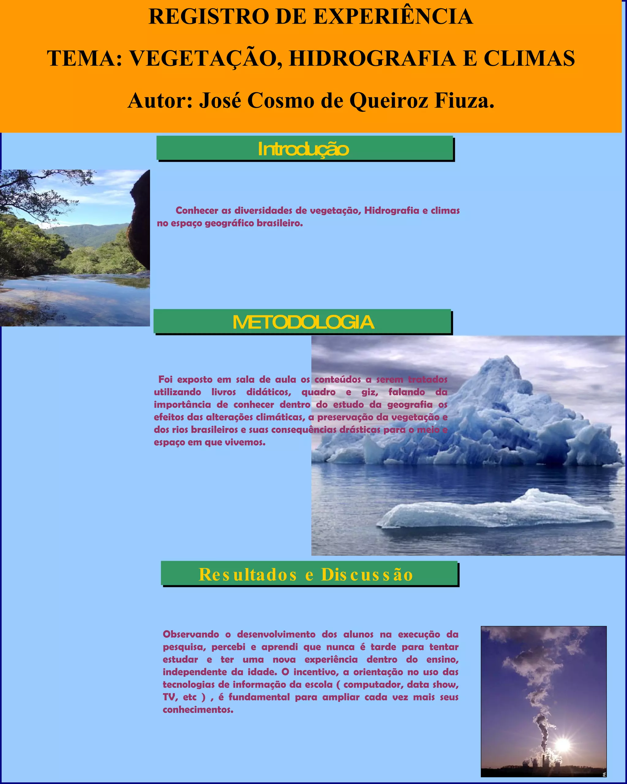 Este documento resume uma aula sobre vegetação, hidrografia e climas no Brasil. O professor apresentou o conteúdo usando livros, quadro e giz, enfatizando a importância de entender os efeitos das mudanças climáticas e preservar a vegetação e rios brasileiros. Ao observar o desenvolvimento dos alunos, o professor aprendeu que nunca é tarde para tentar novas experiências no ensino.