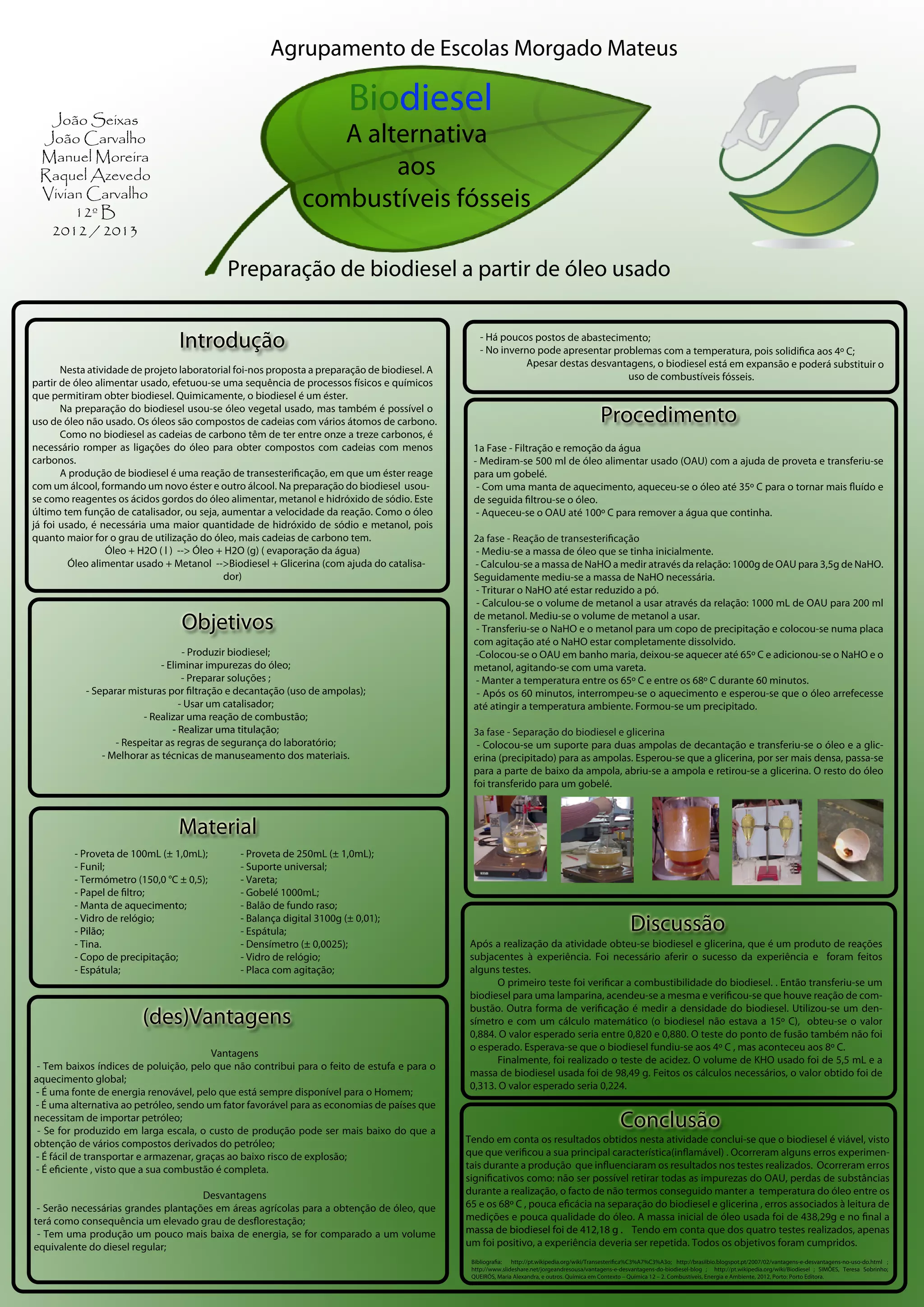 O documento descreve o processo de preparação de biodiesel a partir de óleo alimentar usado. Os principais passos incluem: 1) Filtrar e remover a água do óleo; 2) Realizar uma reação de transesterificação usando óleo, metanol e hidróxido de sódio como catalisador; 3) Separar o biodiesel da glicerina através de decantação. Testes realizados mostraram que o biodiesel produzido era combustível, mas seus resultados nos testes de densidade, ponto de fusão e acide