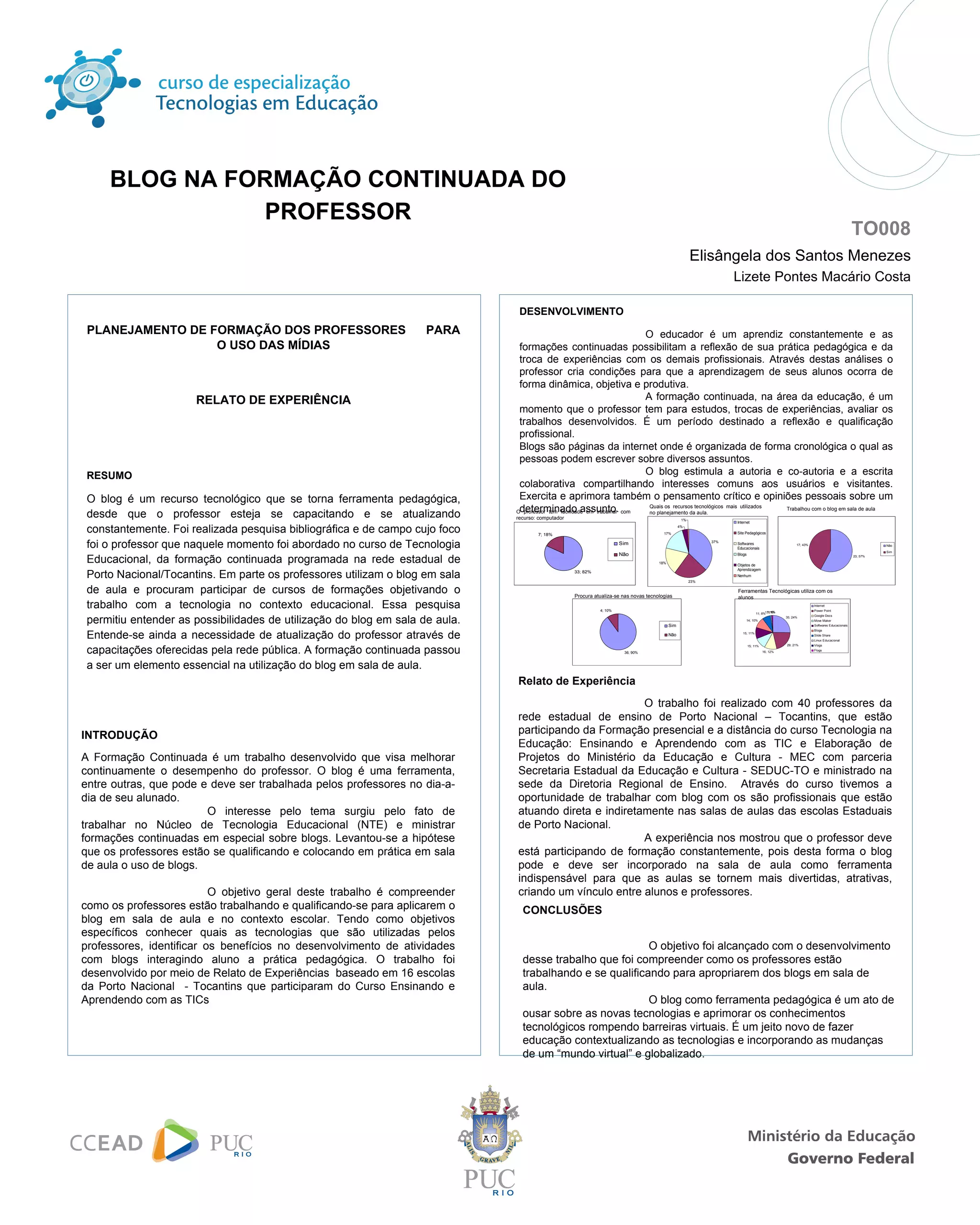 O documento discute como professores estão se capacitando para usar blogs em sala de aula por meio de formação continuada. Uma pesquisa com 40 professores mostrou que alguns já usam blogs, mas precisam de mais treinamento. Cursos sobre tecnologia educacional ajudam os professores, mas é necessário constante atualização para incorporar novas ferramentas de forma efetiva.