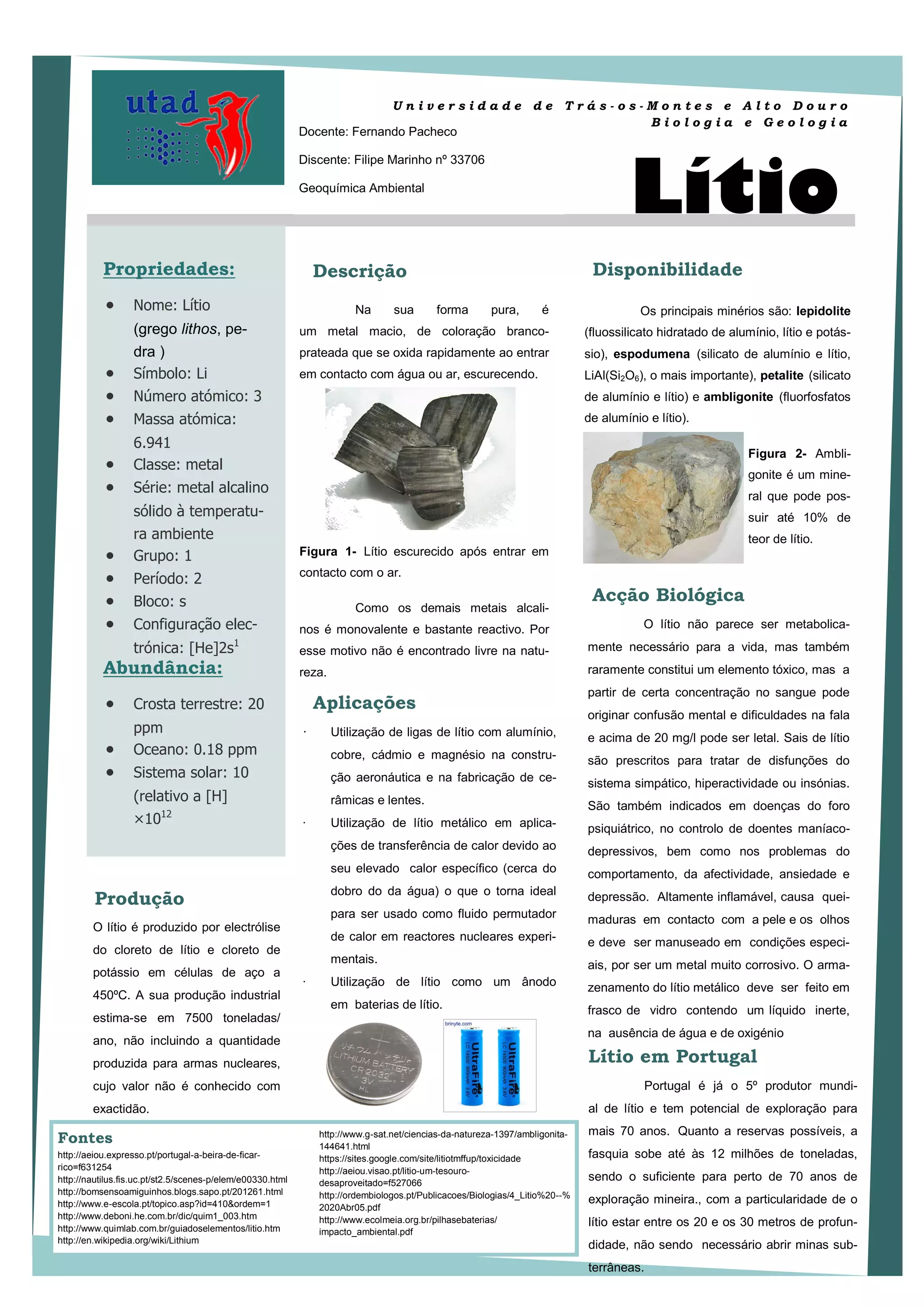 Este documento fornece informações sobre o lítio, incluindo suas propriedades, principais minérios, aplicações e produção. O lítio é um metal alcalino leve, prateado que se oxida rapidamente ao ar. É extraído principalmente da lepidolita, espodumena e petalite. Tem usos em ligas metálicas, baterias e transferência de calor. Portugal tem reservas significativas de lítio e é um dos principais produtores mundiais.