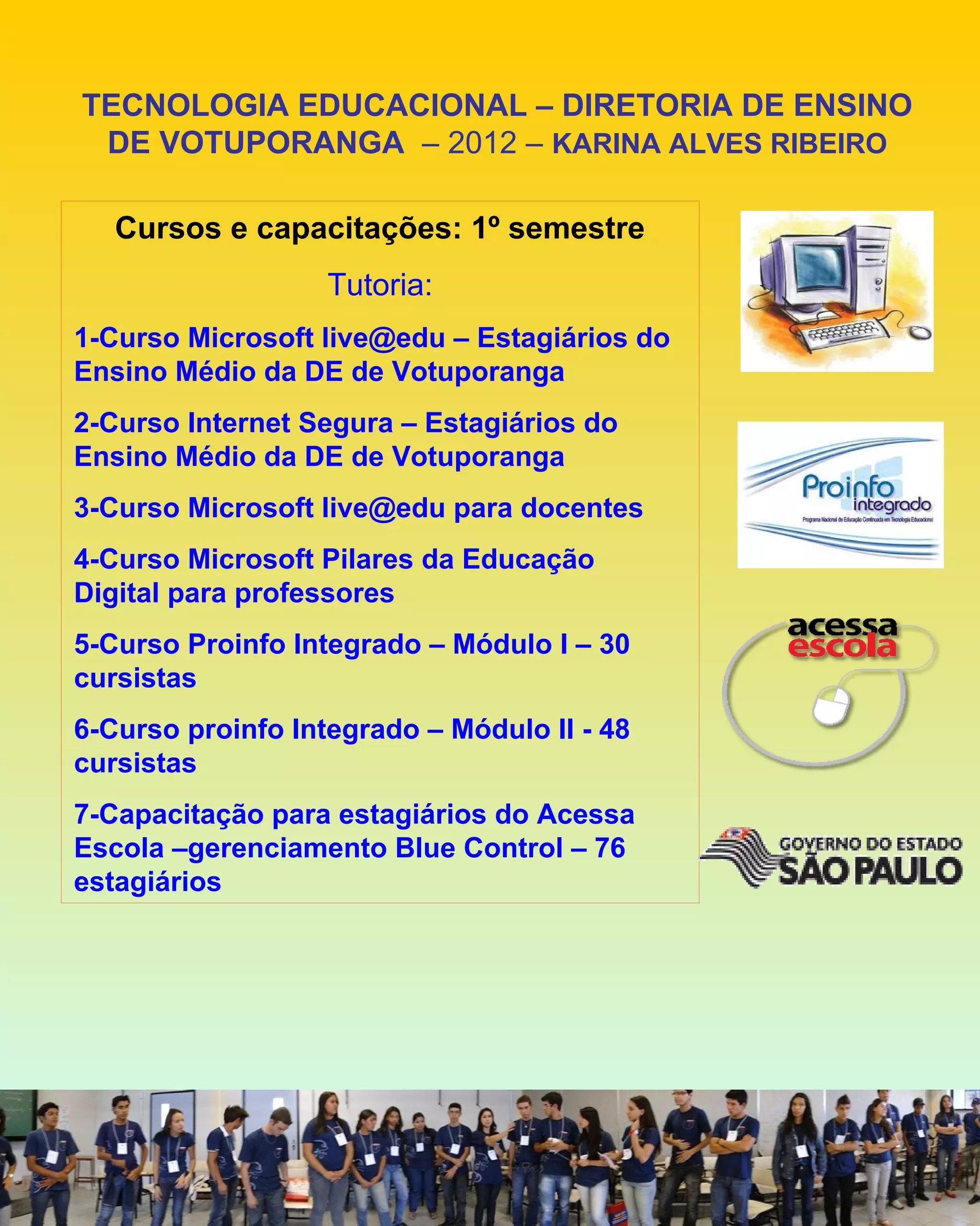 A Diretoria de Ensino de Votuporanga ofereceu diversos cursos e capacitações no primeiro semestre de 2012, incluindo cursos Microsoft para estudantes, professores e estagiários, cursos de internet segura e do programa Proinfo para mais de 150 participantes, e capacitação em gerenciamento escolar para 76 estagiários.