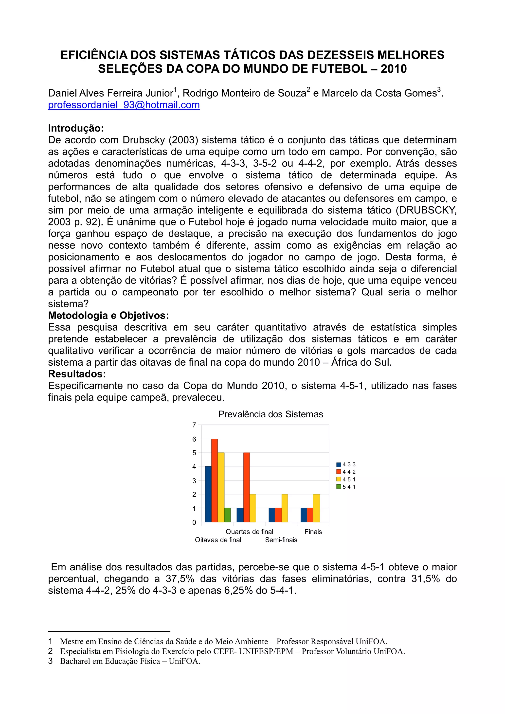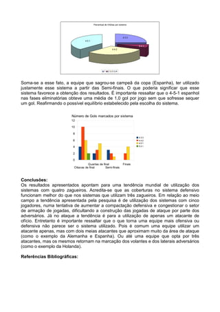 Este documento analisa os sistemas táticos utilizados pelas dezesseis melhores seleções da Copa do Mundo de 2010. O sistema 4-5-1 foi o mais prevalente e teve o maior percentual de vitórias, com a Espanha campeã também utilizando esse sistema. Esse sistema teve média de 1 gol por jogo sem sofrer gols, indicando seu possível equilíbrio.
