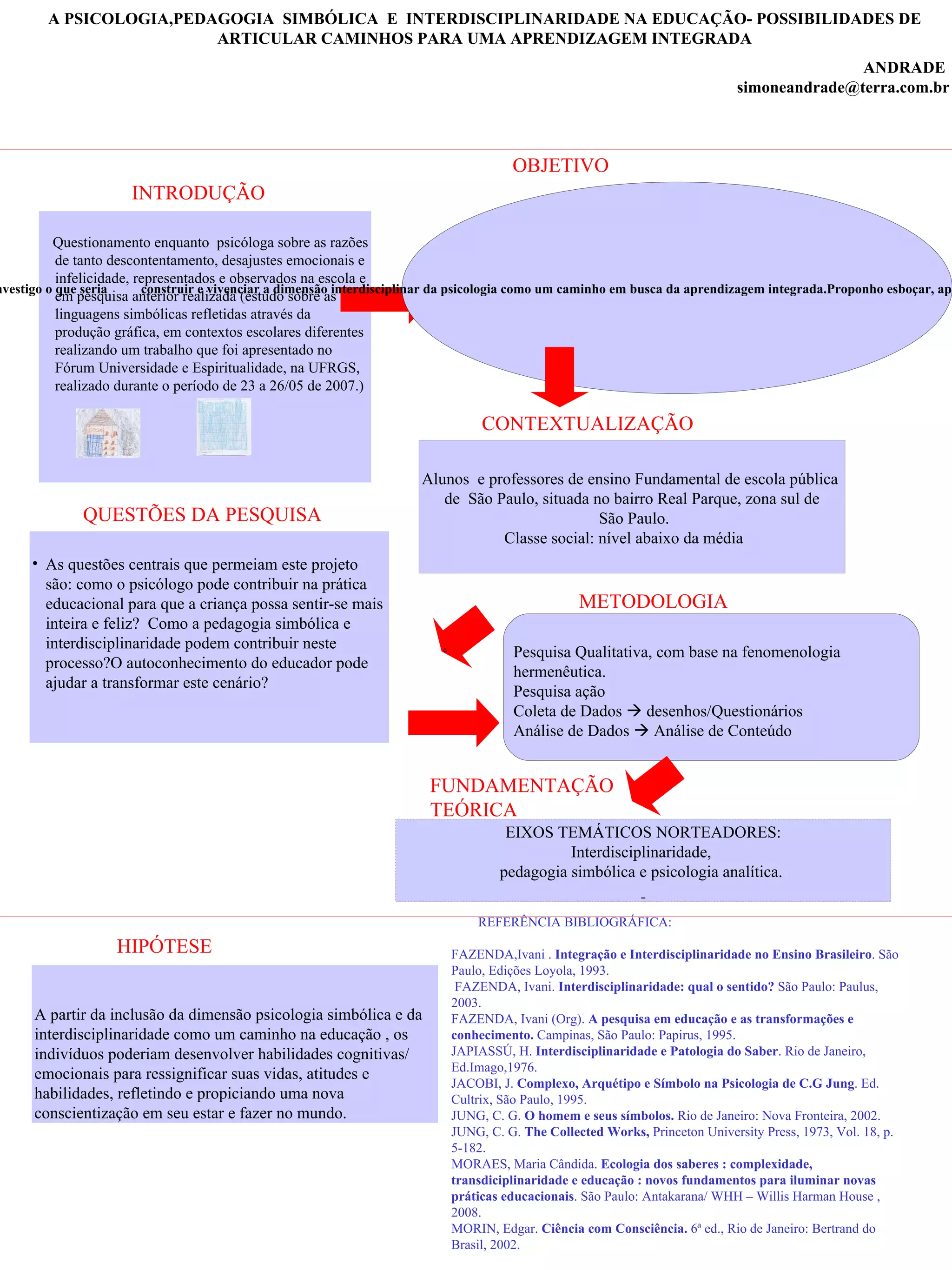Este documento discute como a psicologia, pedagogia simbólica e interdisciplinaridade podem contribuir para uma aprendizagem integrada na educação. A pesquisa propõe explorar como o psicólogo pode ajudar crianças se sentirem mais inteiras e felizes usando linguagem simbólica. A hipótese é que incluir essas abordagens na educação pode ajudar as pessoas a desenvolver habilidades para ressignificar suas vidas de forma consciente.