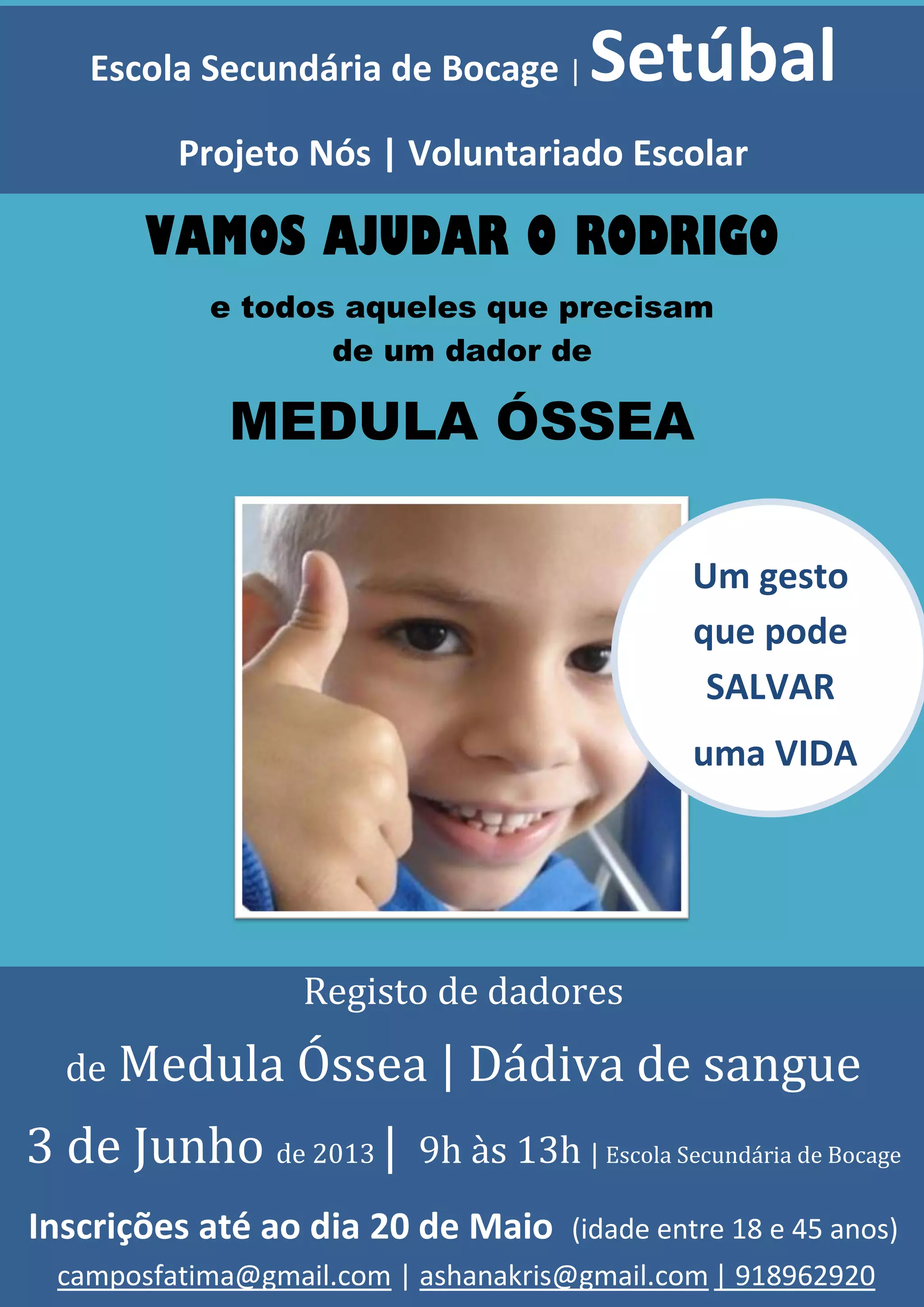 A escola secundária de Bocage em Setúbal está organizando um evento de 3 de junho para registrar dadores de medula óssea e coletar sangue, a fim de ajudar Rodrigo e outras pessoas que precisam de transplantes, com inscrições até 20 de maio para pessoas entre 18-45 anos.