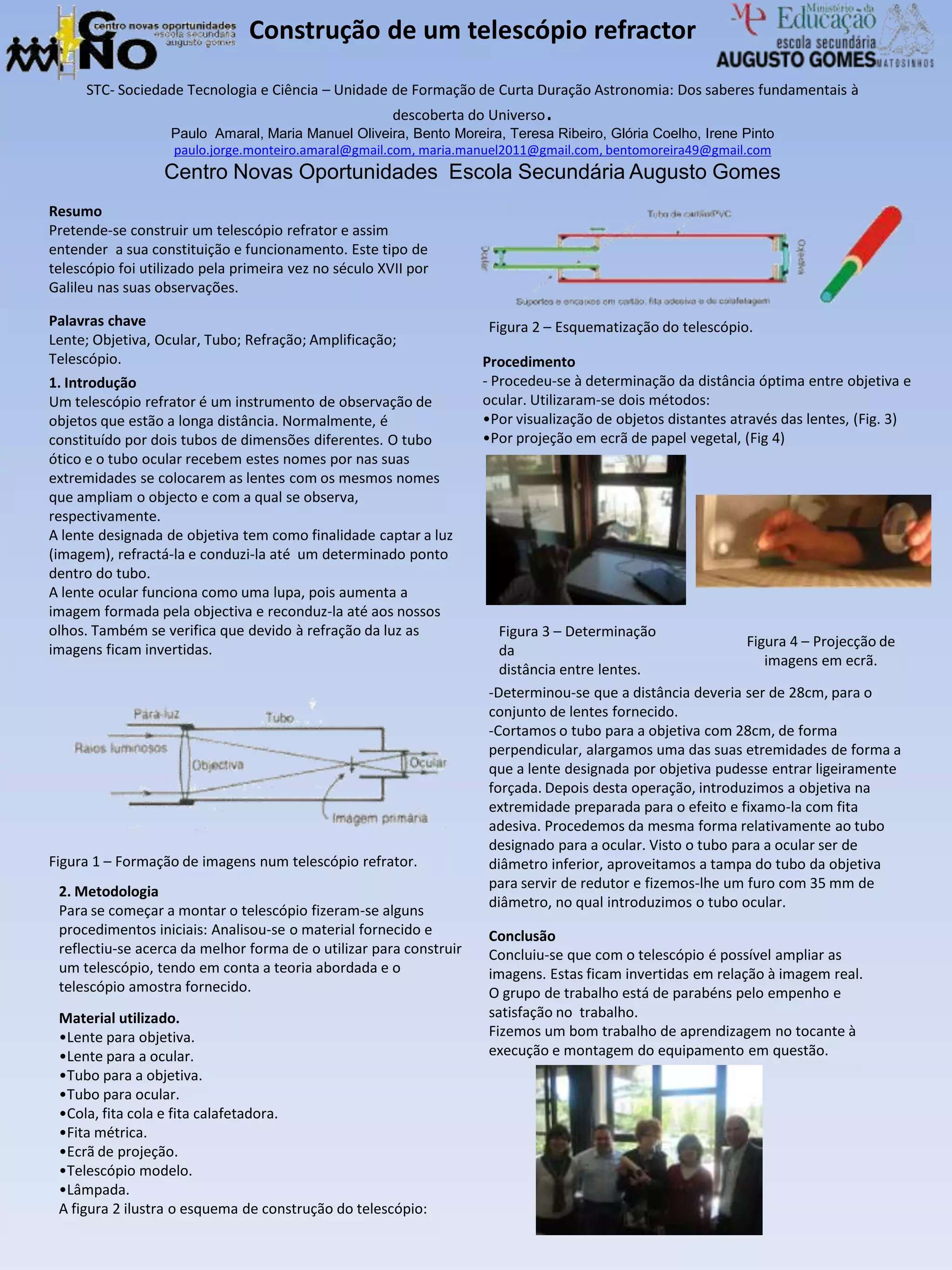 O documento descreve a construção de um telescópio refrator por um grupo, incluindo determinar a distância ótima entre a lente objetiva e ocular, cortar e fixar as lentes nos tubos, e concluindo que o telescópio permite ampliar imagens de forma invertida.