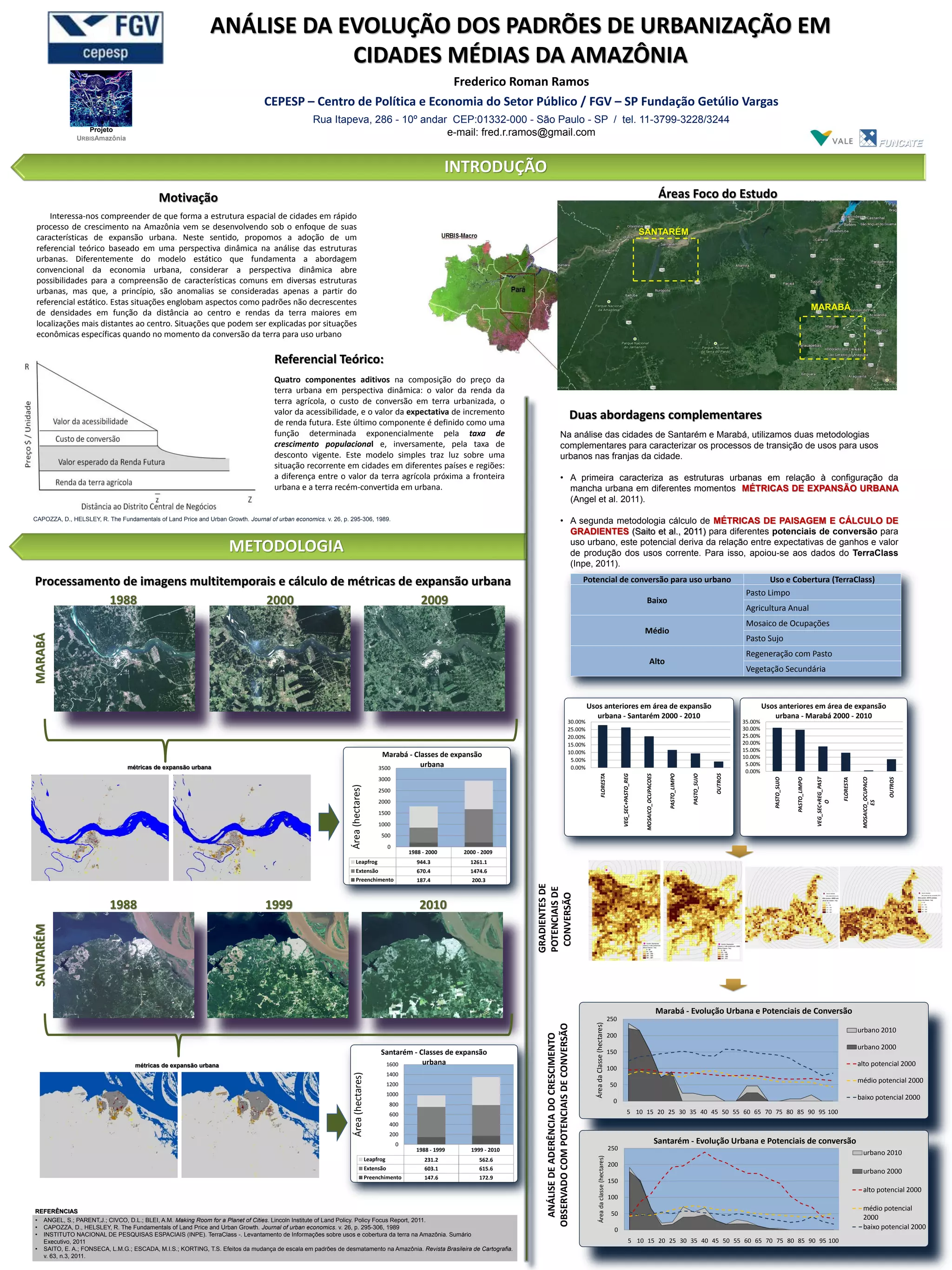 O documento analisa os padrões de expansão urbana nas cidades amazônicas de Santarém e Marabá usando métricas de expansão urbana e gradientes de potencial de conversão. Duas abordagens complementares são usadas: análise de imagens multitemporais e cálculo de métricas de expansão; e mapeamento de gradientes de potencial de conversão com base em expectativas de ganhos e valor atual da terra.