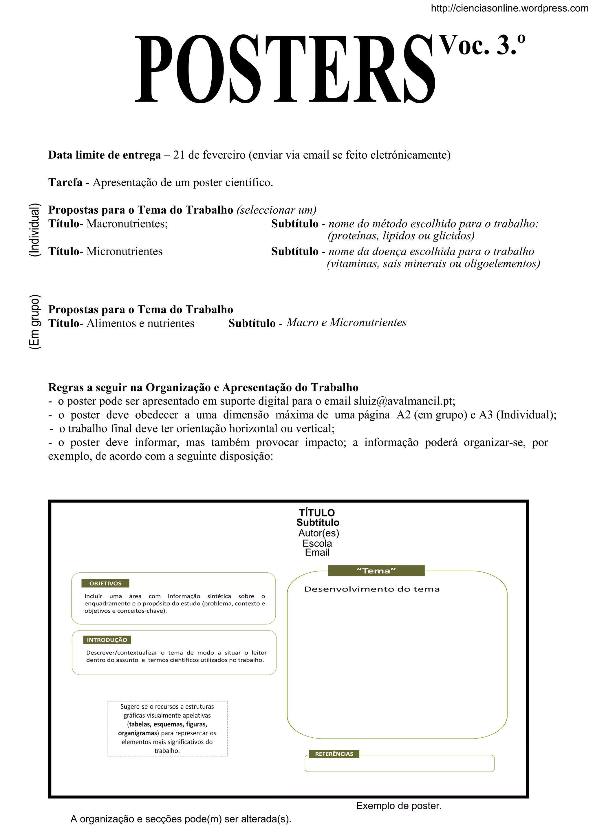 Este documento fornece instruções para a elaboração de um poster científico sobre nutrição. Os alunos podem escolher entre temas como macronutrientes, micronutrientes ou alimentos e nutrientes. O poster deve ter no máximo uma página A2 ou A3 e incluir título, subtítulo, autor, objetivo, introdução e conclusão. Deve também conter imagens e referências bibliográficas. A data limite para entrega é 21 de fevereiro.