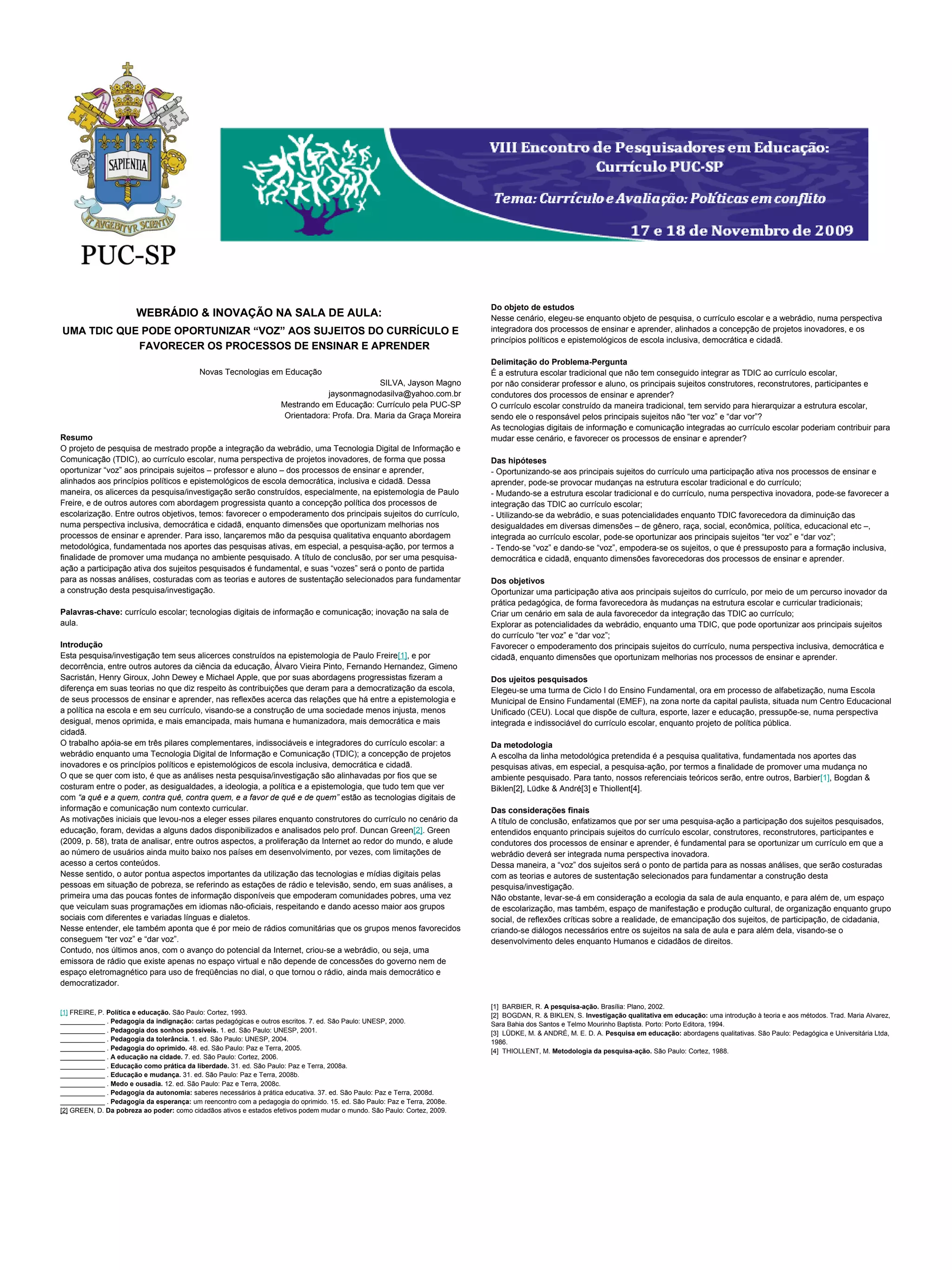 Este documento propõe a integração da webrádio ao currículo escolar com o objetivo de dar voz aos alunos e professores e melhorar os processos de ensino e aprendizagem de forma inclusiva, democrática e cidadã. A pesquisa será qualitativa e utilizará a pesquisa-ação, envolvendo uma turma de alunos do ensino fundamental para analisar como a webrádio pode empoderar os sujeitos do currículo.