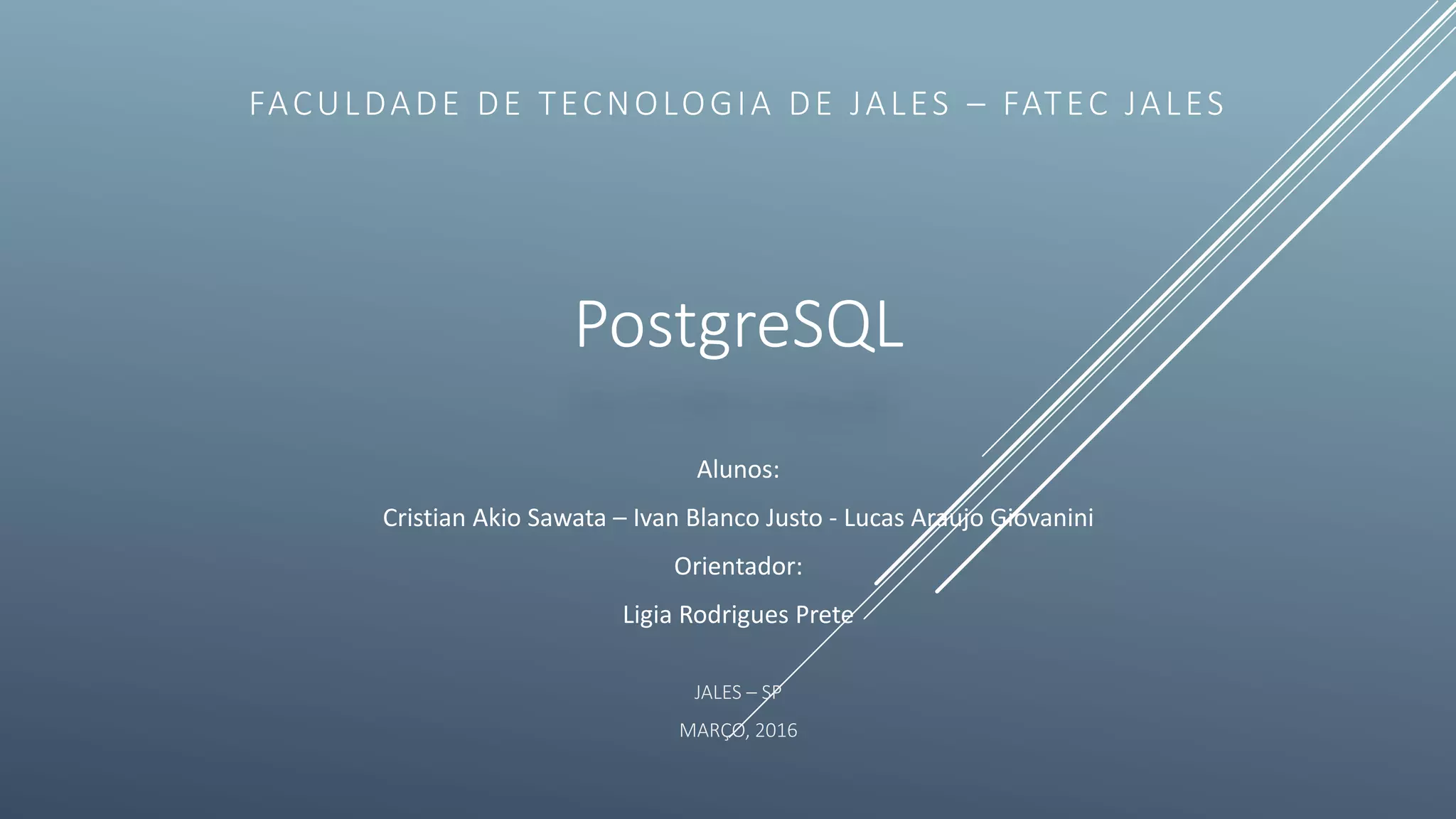 - O documento discute o PostgreSQL, um sistema gerenciador de banco de dados de código aberto, incluindo sua história, vantagens, estrutura e empresas que o utilizam.