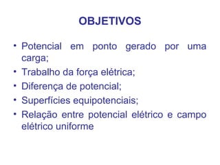 O documento aborda conceitos fundamentais sobre potencial elétrico, incluindo a definição de trabalho da força elétrica e diferenças de potencial entre pontos. Destaca a relação entre superfícies equipotenciais e campos elétricos, com exemplos numéricos de cálculo de potencial. Finalmente, apresenta exercícios para consolidar a compreensão dos tópicos discutidos.