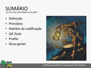 O documento aborda a importância da qualidade de código no desenvolvimento de software, explorando princípios e padrões de codificação, bem como ferramentas para garantir essa qualidade. São discutidos conceitos como KISS, DRY e SOLID, além de práticas recomendadas e metodologias de análise estática e dinâmica. O texto também menciona diversas ferramentas de QA e profiling que auxiliam na detecção de problemas e otimização do código.