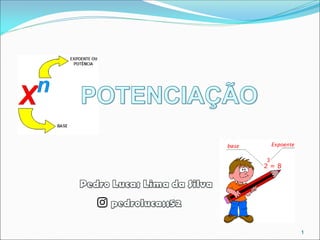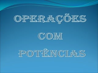 O documento discute conceitos básicos de potenciação, incluindo: 1) como escrever um produto de fatores iguais de forma abreviada usando potências; 2) a definição formal de potência com base e expoente; 3) regras para cálculo de potenciação com números positivos e negativos.