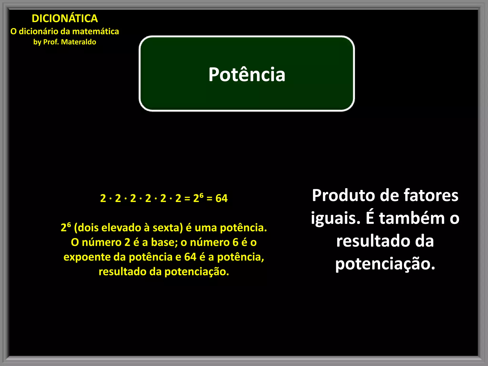 A potência é o resultado da repetição de um fator um número determinado de vezes. A base é o número que se repete e o expoente indica quantas vezes a base é repetida. Assim, 26 significa 2 multiplicado por si mesmo 6 vezes, resultando no número 64.