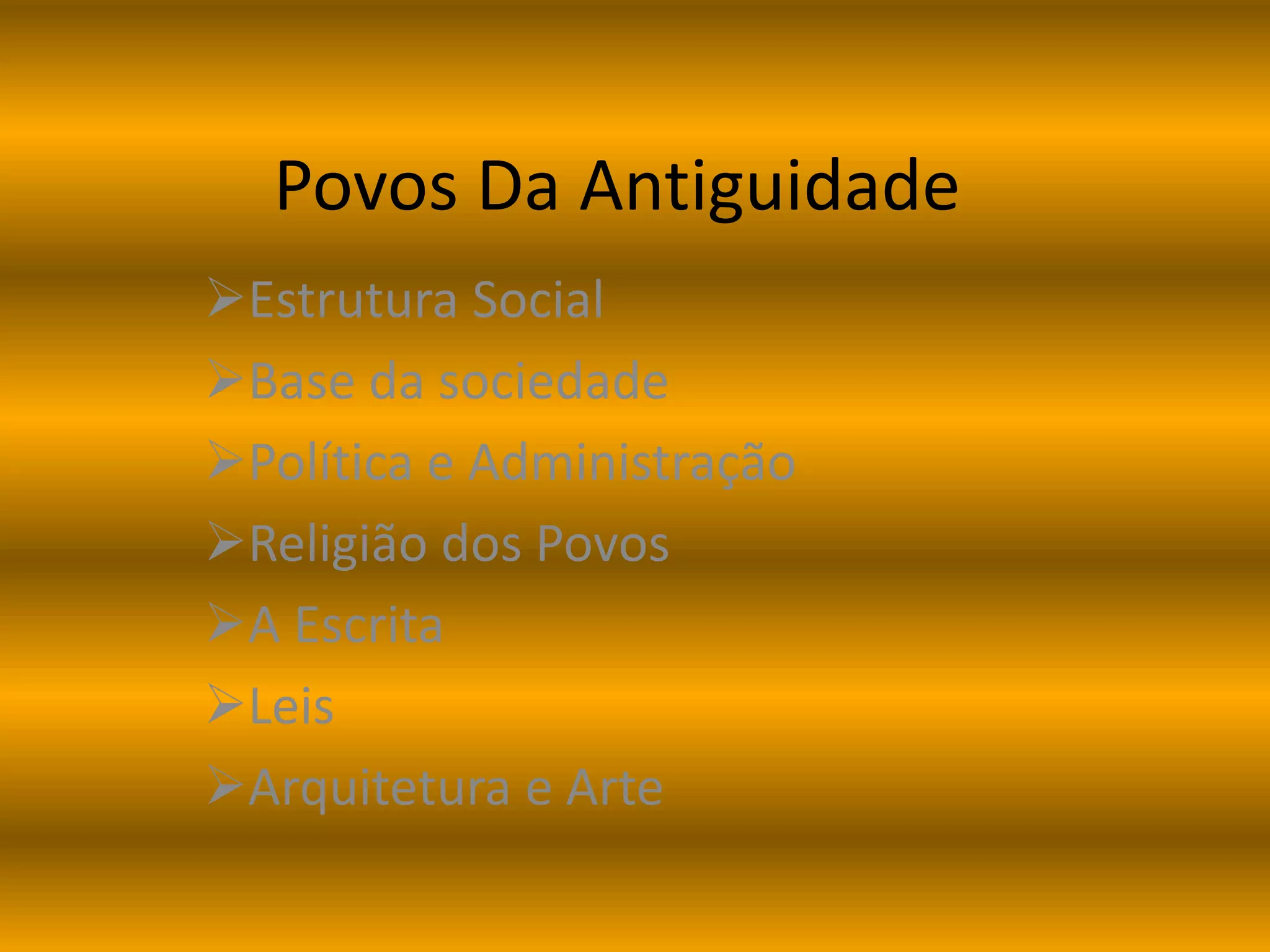 O documento discute a estrutura social, política, religião e artes dos povos da antiguidade. A sociedade era hierárquica, com nobres no topo e escravos no fim. A família patriarcal era a base. Os governos eram monarquias teocráticas e as religiões eram politeístas ou do deus único. A escrita surgiu por volta de 4000 a.C nos Sumérios e Egípcios. Leis como o Código de Hamurabi se baseavam na lei do talião. Arquitetura