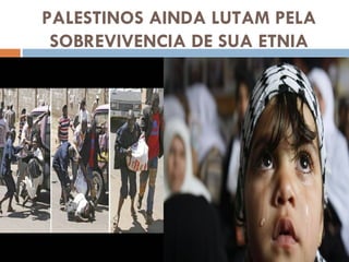 O documento discute a história do conflito entre israelenses e palestinos, incluindo vários eventos como a Guerra dos Seis Dias e a Revolução Egípcia de 2011. Também aborda as dificuldades econômicas do Egito e os desafios enfrentados pelo povo palestino em busca de sua identidade nacional.