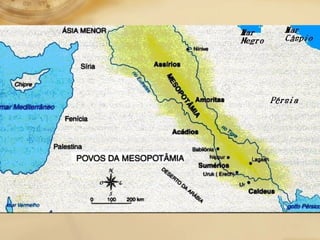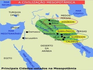 A Mesopotâmia era a região entre os rios Tigre e Eufrates e foi ocupada por vários povos como os sumérios, amoritas, assírios e caldeus. Os sumérios foram a primeira civilização e criaram a escrita cuneiforme. Os amoritas formaram o primeiro império babilônico sob Hamurabi, que criou o Código de Hamurabi. Os assírios conquistaram a Mesopotâmia e expandiram seu território através da violência. Os caldeus formaram o segundo império