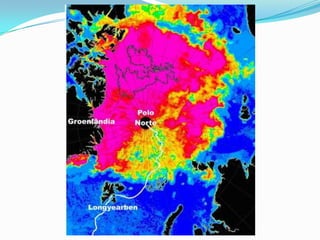 O documento discute o rápido degelo do Ártico, que está permitindo a navegação em áreas antes cobertas por espessas camadas de gelo. O degelo está sendo causado pelo aquecimento global resultante da emissão humana de gases do efeito estufa como o CO2. Se o degelo continuar nesse ritmo, ele trará graves consequências como a elevação do nível do mar e ameaças a espécies como os ursos polares.