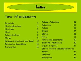 Este documento fornece informações sobre os efeitos do álcool e do tabaco na saúde, descrevendo os riscos do alcoolismo e do tabagismo, assim como os estágios da intoxicação pelo álcool e os sintomas da abstinência do tabaco. O documento também discute os tratamentos para o alcoolismo e ressalta a importância de evitar o consumo excessivo de álcool e tabaco.