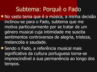 O documento discute a origem e importância do fado como parte da identidade cultural de Portugal. Ele descreve como o fado surgiu na primeira metade do século 19 e possivelmente tem origens nos cantos mouriscos. O documento também destaca a importância de Amália Rodrigues, considerada a rainha do fado e maior embaixadora da cultura portuguesa no mundo. Finalmente, reconhece a nova geração de fadistas como Cámané e Marisa.